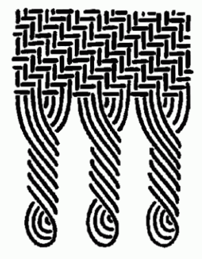 Новгородские шерстяные ткани, имеющие саржевое переплетение, можно разделить на несколько групп: а) «обычные» ткани, не имеющие каких-либо характерных признаков, буро-коричневого цвета, нередко появляющегося под действием почвенных кислот. По своему характеру эти ткани приближаются к «обычным» тканям, имеющим полотняное (рис. 15) переплетение; б) валяные ткани, среди которых встречаются крашеные; в) крашеные неваляные ткани; г) вариантом саржевого переплетения 2/2 является переплетение, основывающееся на том же принципе, но с ломаным рубчиком — так называемая елочка (рис. 16).
