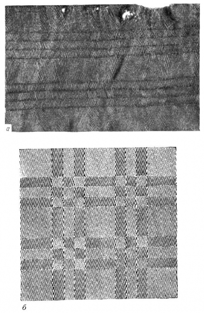 Приступая к разбору так называемых ажурных тканей, мы должны отметить, что не все они выполнены в одной технике, но с точки зрения технологии производства они делятся на две группы. Это различие отчетливо выступает и в расположении ажуров. Хотя обе группы ажурных тканей имеют в своей основе полотняное переплетение, в одной группе тканей ажуры располагаются просто и нити основы и утка проходят параллельно (рис. 12, а); в другой— просветы группируются по-разному, а нити основы и утка располагаются в ткани не параллельно, а в виде волн. Нередко в этих последних отчетливо виден узор или фрагмент какого-то рисунка (рис. 12, б).