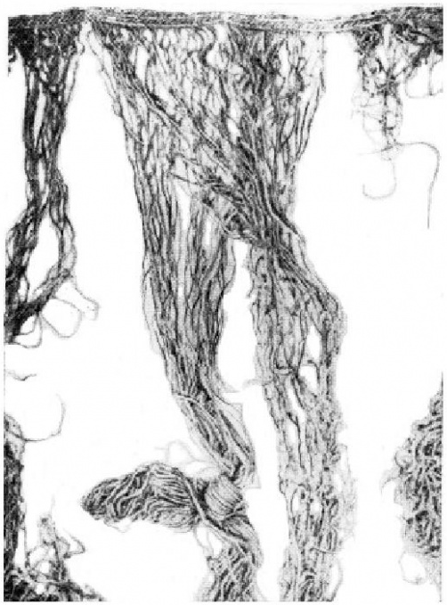 Другая очень интересная новгородская ткань — Н-54/4187, ярус 17/18. Эта ткань имеет так называемую начальную, третью кромку, изготовленную на дощечках, причем между двумя полосками, выполненными на дощечках, видно дополнительное переплетение нитей, но, к сожалению, раппорт этого переплетения точно определить не удалось (рис. 19). Кромки такого рода, изготовленные на табличках, частое явление в тканях XII в. Можно назвать ряд аналогичных тканей. Такие ткани обнаружены в Corse litze70 — комплексе, датируемом III в. н. э. Очень любопытны также находки в Тегле71 (рис. 32), у которых видно начальную кромку ткани со свисающими нитями основы, еще не затканной утком. В Гданьске в пластах, относящихся к эпохе раннего средневековья, были также найдены фрагменты тканей с третьей кромкой, изготовленной на ткацких дощечках72. Украшенные металлическими колечками ткани, концы и соответственно начала которых вытканы на ткацких табличках, — частое явление в древней Руси и в восточной Прибалтике73. Особенно надо отметить уже упоминавшуюся ткань из Старой Ладоги, которая наряду с кромкой, вытканной в форме рубчика, имеет также третью кромку, выполненную на табличках.