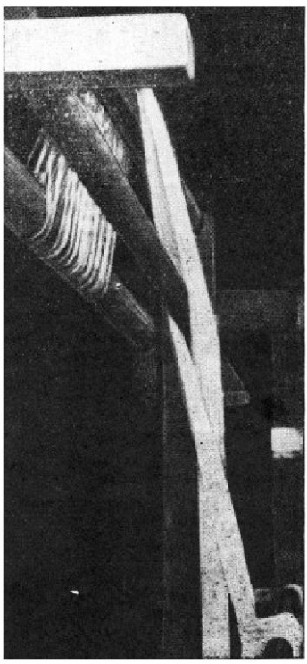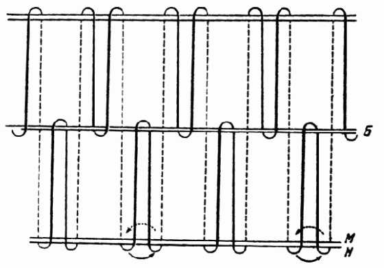 Интересны причины возникновения петель при тканье килимов на вертикальных народных ткацких станках в Норвегии, о чем пишет М. Гофман". В этом случае петли возникают благодаря навиванию основы между двумя горизонтальными брусами, укрепленными на ткацком станке, с протянутыми шнурами. Когда ткань готова и шнуры вынуты, из нитей основы образуются петли (рис. 36).