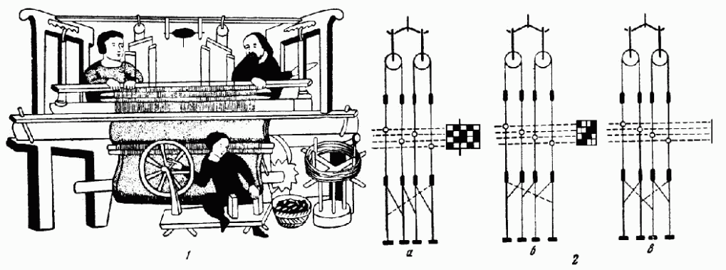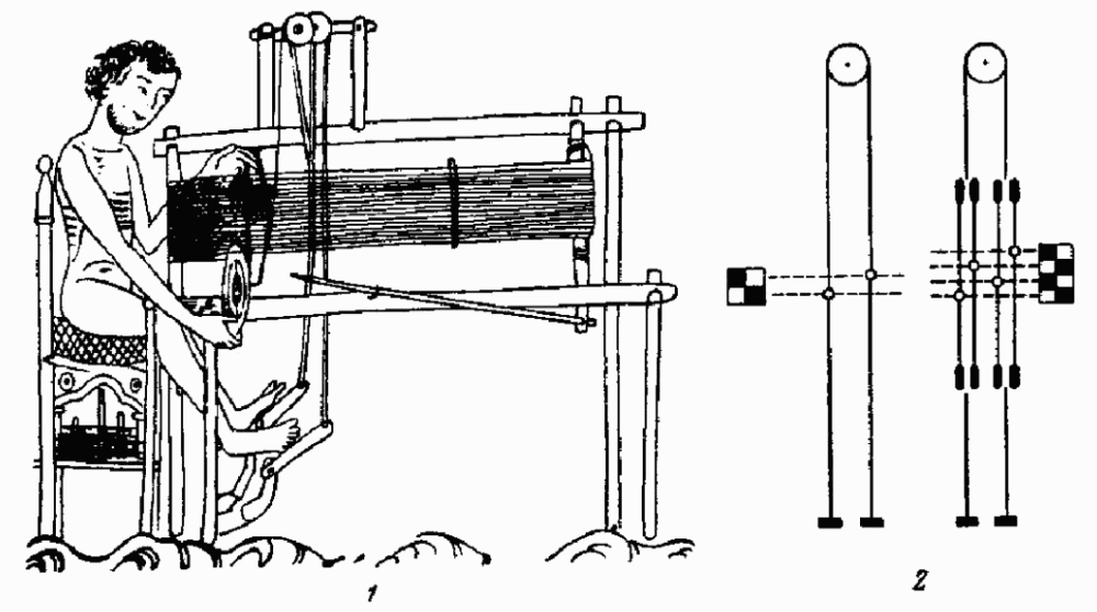 1. Простейшее устройство для полотняного переплетения в тканях с наименьшей плотностью основы, т.е. в продукции третьего и четвертого сорта. Оно состояло из двух ниченок, подвешенных на блочках или коромыслецах, укрепленных на потолке или на поперечной балке стана. Поочередно нажимая то на одну, то на другую подножку, ткач поднимает то одну, то другую ниченку. Такое устройство широко отражено в иконографическом материале XIII и XIV вв. (рис, 40,1, 2).