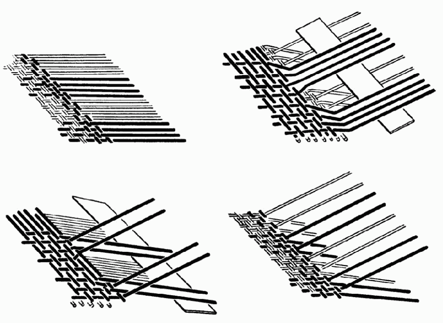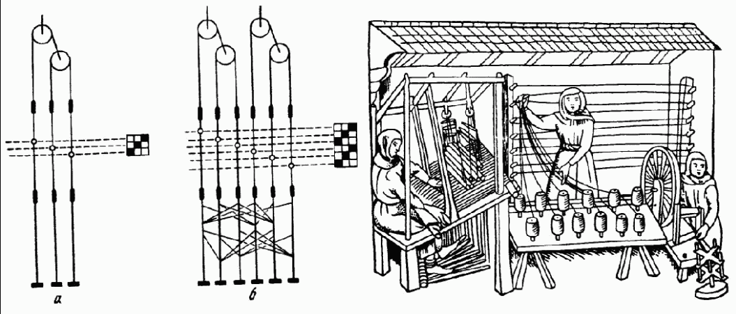 В задачу настоящей работы не входит рассмотрение конструкции новгородского горизонтального ткацкого станка. Но нужно остановиться на устройстве, служащем для образования зева в этом станке, так как эта проблема имеет исключительно важное значение для анализа текстильных переплетений. Это устройство в горизонтальном ткацком станке состоит из совокупности ниченок, подвешенных на блочках или коромыслецах. К ниченкам присоединяются подножки. Нажимая ногой подножку, ткач получает зев.
