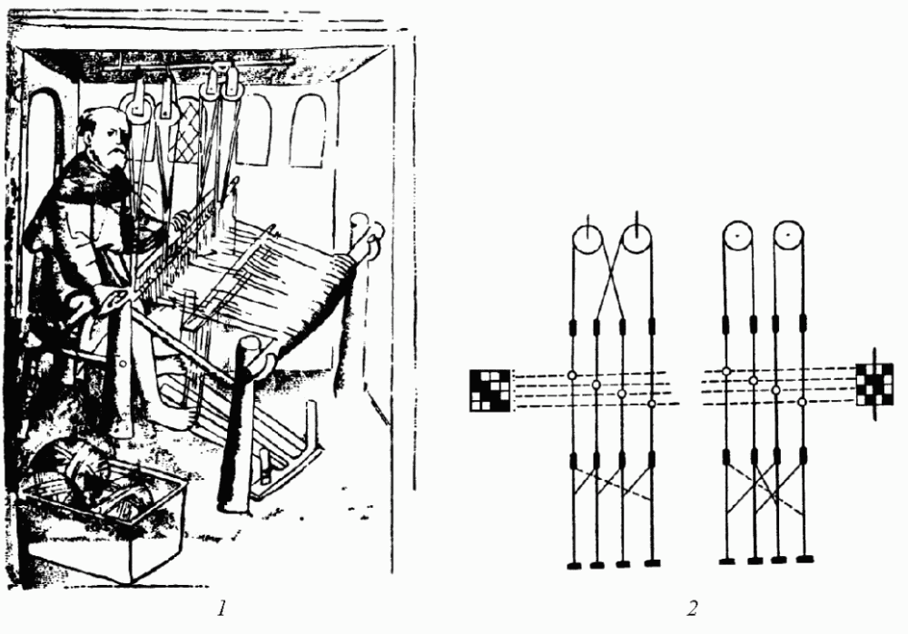 5. Следующая группа переплетений, требующая особого устройства для образования зева, — саржевое переплетение 2/2, а также крестообразное переплетение 2/2. В работе, посвященной гданьскому текстилю X—XIII вв.81, авторы подробно останавливаются на устройстве такого типа. Поскольку новгородский материал в этом отношении соответствует гданьскому (в обоих городах обнаружены ткани как с саржевым переплетением 2/2, так и с крестообразным переплетением 2/2), мы можем опираться на положения, выдвинутые в упомянутой работе. Так, ткани с саржевым переплетением в четыре нитки должны были ткаться с помощью четырех ниченок. В средние века были известны два способа их подвески. Рис. 42, 1 иллюстрирует подвеску ниченок на ткацком станке XIV в., известную по Кодексу Менделя, датированному приблизительно 1384 г. Здесь можно видеть блочки, на которых подвешены ниченки. Эти блочки могут вращаться вокруг собственной оси, но так как они неподвижно прикреплены к потолку, их положение по отношению друг к другу остается постоянным. В нижней части станка гравюра дает изображение четырех подножек, на которые ткач нажимает ногами. Отсюда можно сделать вывод, что ткацкий станок имел четыре ниченки, хотя гравюра дает такое запутанное изображение, что определенно этого сказать нельзя. На этом станке можно было также делать полотняные переплетения, но тогда четыре подножки, изображенные на гравюре, были бы излишними. На гравюре есть еще одна неточность: веревочки, висящие на правой паре блочков (вверху между блочками). Скрещивание нитей ясно видно на рис. 42,1. Такое скрещивание свидетельствует о саржевом переплетении 2/2. Описанное выше устройство могло употребляться в Новгороде для выработки саржи с раппортом 2/2 в момент появления горизонтального ткацкого станка с подножками.