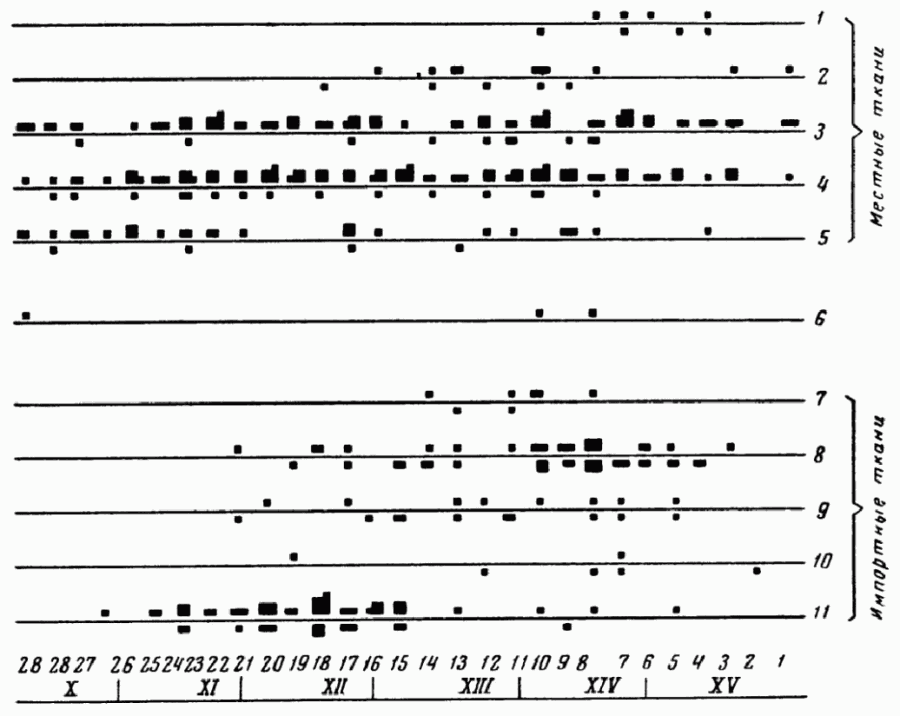 Выше мы указали на характерную разницу между импортными тканями и тканями местного производства. На рис. 45 показано, что импортные ткани появляются спорад1гчески, характерными группами, в то время как ткани местного производства в основной своей массе появляются в слоях всех ярусов в равной степени. Однако и здесь некоторые группы появляются в одних ярусах и отсутствуют в других.