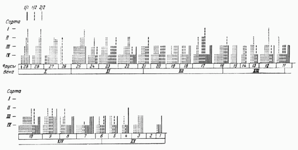 Диаграмма показывает, что при традиционной технике ткачества, распространенной на территории Новгорода, а также, возможно, на территории всей Руси, употреблялось саржевое переплетение 2/2. Это переплетение преобладает в шерстяных тканях третьего и четвертого сорта местного производства, насколько об этом можно судить на основании данных раскопок. Относительное уменьшение количества тканей с таким переплетением в XIV—XV вв. по сравнению с тканями полотняного переплетения объясняется увеличением в этот период количества ажурных тканей, в основе которых лежит полотняное переплетение. По-видимому, в Северной Европе саржевое переплетение 2/2 было распространено почти повсеместно. Подобное же соотношение тканей с саржевым переплетением 2/2, с одной стороны, и тканей с полотняным переплетением 1/1, а также тканей с саржевым переплетением 2/1, с другой, наблюдается в материалах раскопок Ополья (X— XII вв.), Гданьска (X— XIII вв.)105, наиболее архаических слоев Старой Ладоги106, в шведской Бирке и в Дании107. Другую картину представляет собой развитие местного производства тканей саржевого переплетения 1/1 в три нитки. Диаграмма (рис. 47) показывает, что количество тканей этого вида, судя по результатам раскопок, увеличивается с XI по XIII в., а в течение двух последующих столетий наблюдается спад их производства. Подобное же увеличение количества тканей с саржевым переплетением 2/1 в три нитки мы наблюдаем и на материалах Гданьска (X—XIII вв.).