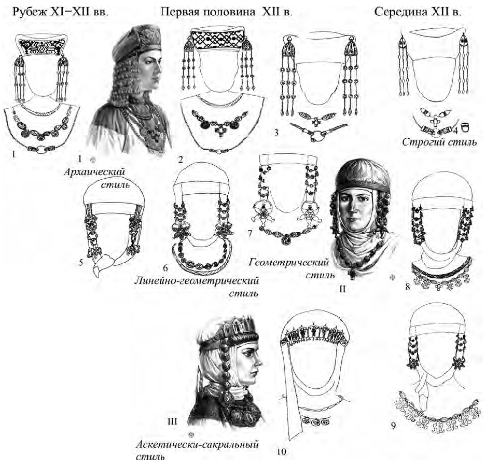 I – кичкообразный убор с колоколовидными ряснами и цепями; II – ленточный с колтами 1 группы; III – эмалевый убор с убрусом и диадемой; реконструкции по конкретным кладам: 1 – Мартыновка, 1886 г.; Мироновский фольварк, 1883 г. Киевской губ.; 2 – Старая Рязань, 1967 г., Тверь, 1906 г.; 3 – Кресты Тульской обл., 1876 г., Старая Рязань, 1868 г.; 4 – Чернигов, 1958 г., Старая Рязань, 1887 г., 1979 г.; 5 – погребение под фундаментами Борисоглебского собора, Старая Рязань, 2001 г.; 6 – Старая Рязань, 1970 г.; 7 – Владимир, 1837 г.; 8 – Киев, Михайловский монастырь, 1903 г.; 9 – Киев, усадьба Лескова, 1876 г.; 10 – Киев, усадьба Гребеновского, 1889 г. I, 1, 5 – рубеж XI-XII вв.; II, III, 2, 3, 6, 7, 10 – первая половина XII в.; 4, 8, 9 – середина XII в. I, 1 – архаический стиль; 2 – линейно-геометрический стиль; II, 3, 6-9 – геометрический стиль; III, 10 – аскетически-сакральный стиль; 4 – строгий стиль