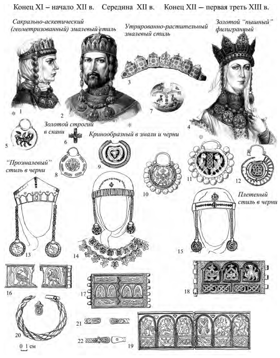 1, 2 – типовые реконструкции женского и мужского княжеского эмалевого убора в сакрально-аскетическом стиле; 3 – Сахновка Киевской губ., 1900 г.; 4 – типовая реконструкция женского княжеского эмалево-филигранного убора в пышном стиле; 5 – Киев, Михайловский монастырь, 1824 г.; 6 – Старая Рязань, 1822 г.; 7, 12 – Киев, Десятинная церковь, 1842 г.; 8, 14 – Киев, усадьба Орлова, 1901 г.; 9 – Киев, ул. Мало-Владимирская, 1893 г.; 10 – Терехово Орловской губ., 1876 г.; 11, 20 – Святое Озеро Черниговской губ., 1908 г.; 13,15, 21 – Киев, Михайловский монастырь, 1903 г.; 16 – Романово Могилевской обл., 1892-1893 гг.; 17 – Городище Хмельницкой обл., 1970 г.; 18 – Киев, ул. Стрелецкая, 1939 г.; 19 – Тверь, 1906 г.; 22 – Киев, Михайловская гора, 1841 г. Конец XI – начало XII вв.: 1, 2, 5 – сакрально-аскетический (геометризованный) эмалевый стиль; 6 – золотой строгий сканый стиль; 8, 13, 16, 20 – проэмалевый стиль в черни. Середина XII в.: 9, 10, 14, 17, 21, 22 – кринообразный стиль в эмали и черни. Конец XII – первая треть XIII вв.: 3, 7 – утрированно-растительный стиль в эмали; 4 – золотой пышный стиль в филиграни; 11, 12, 15, 18, 19 – плетеный стиль в черни