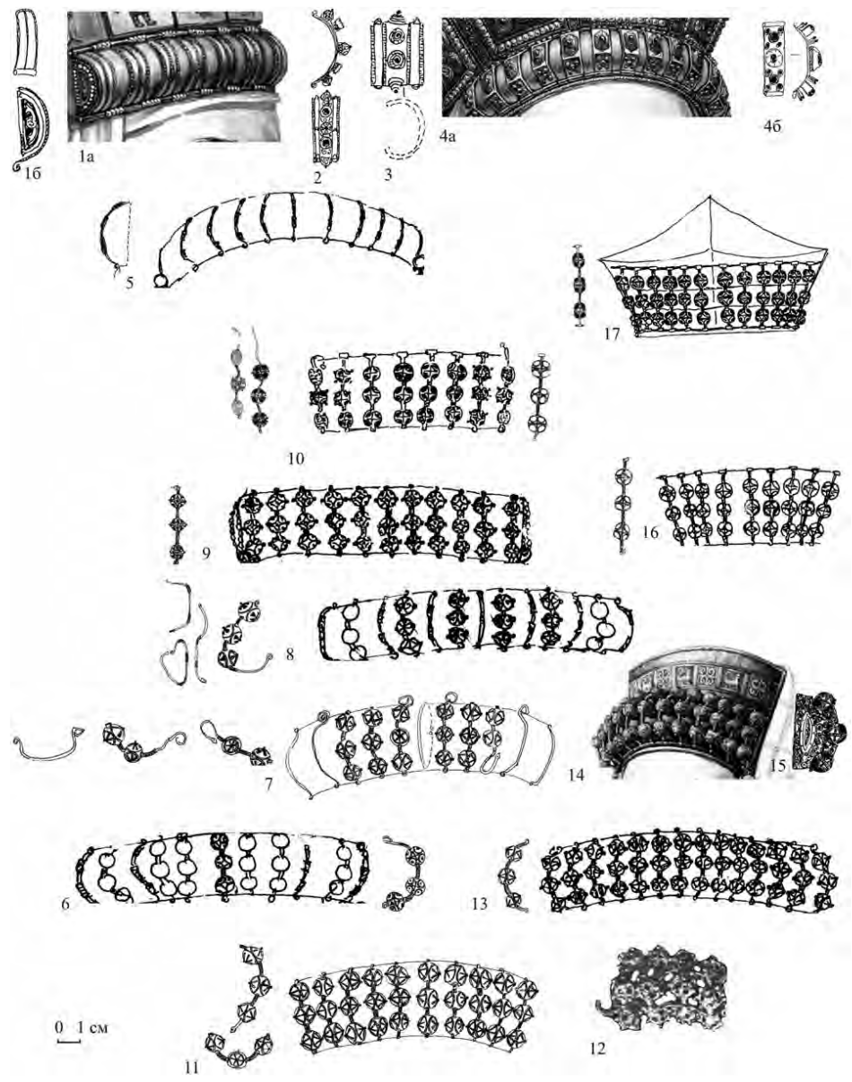 1а – типовая реконструкция очелья эмалевого убора; 1б – Киев, усадьба Лескова, 1876 г.; 2 – Киев, Михайловский монастырь, 2000 г.; 3 – д. Колесище Каневского у. Киевской губ.; 4 – Киев, Михайловский монастырь, 1824 г.; 5 – Киев, усадьба Гребеновского, 1899 г.; 6, 7 – Старая Рязань, 1967 г.; 8 – Старая Рязань, 1974 г.; 9 – Льгов, 1979 г.; 10 – Владимир, 1837 г.; 11 – Старая Рязань, 1979 г.; 12 – Вербов Львовской обл., 1920-е гг.; 13 – Терехово Орловской губ., 1876 г.; 14 – типовая реконструкция очелья из трехбусинных дужек; 15 – Старая Рязань, 1992 г.; 16 – Владимир, 1865 г.; 17 – Владимир, 1896 г