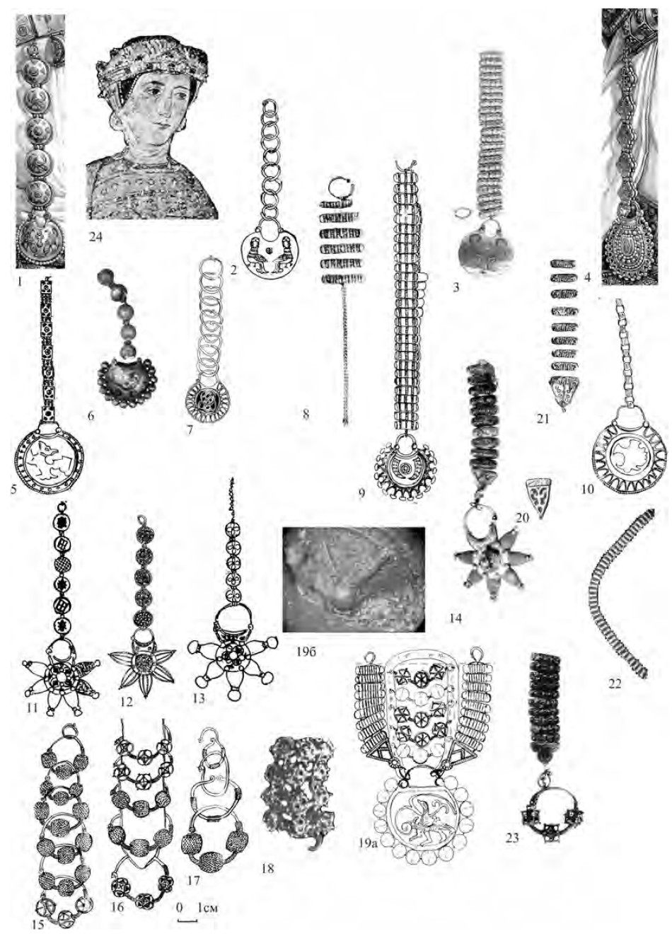 Рис. 14. Развитие рясен-цепей для колтов во второй половине XII в. - первой трети XIII в. 1 – типовая реконструкция ношения эмалевых колтов на ряснах с круглыми бляшками; 2 – Киев, усадьба Есикорского, 1885 г.; 3, 16 – Киев, Десятинная церковь, 1936 г.; 4 – типовая реконструкция ношения эмалевых колтов на ряснах с квадрифолийными бляшками; 5, 12 – Киев, Михайловский монастырь, 1903 г.; 6 – Губин Болоховской земли, № 2; 7 – Киев, 1909 г.; 8 – Киев, 1906 г.; 9 – Киев, 1914 г.; 10 – Киев, усадьба Трубецкой, 1872 г.; 11 – Старая Рязань, 1937-1950 гг.; 13 – Москва, 1988 г.; 14 – Старая Рязань, 1974 г.; 15 – Киев, 1911 г.; 17 – Киев, 1898 г.; 18, 20, 22 – Вербов Львовской обл., 1920-е гг.; 19а – Старая Рязань, 2005 г.; 19б – отпечаток скано-зерненой орнаментации трехбусинной дужки на кожаной детали, микрофото Н.В. Жилиной; 21 – Болохов, клад № 5; 23 – Киев, Десятинная церковь, до 1899 г.; 24 – убор Десиславы, фреска церкви св. Пантелеймона в Бояне, Болгария, середина XIII в.