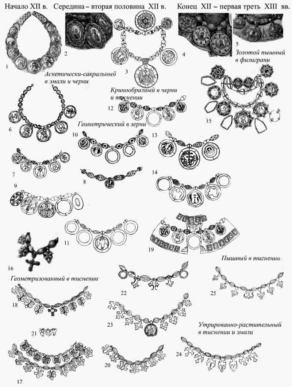 1 – Каменный Брод Киевской губ., 1903 г.; 2 – Киев, Михайловский монастырь, 1824 г.; 3 – Исады, Суздаль, 1851 г.; 4 – Старая Рязань, 1822 г.; 5, 15 – Сахновка Киевской губ., 1900 г.; 6, 7 – Старая Буда Киевской губ., 1908 г.; 8,13 – Владимир, 1837 г.; 9 – Киев, ул. Стрелецкая, 1939 г.; 10 – Старая Рязань, 1970 г.; 11, 22 – Владимир, 1865 г.; 12, 19, 21 – Старая Рязань, 1868 г.; 14 – Москва, 1988 г.; 16, 20 – Киев, Михайловский монастырь, 1903 г.; 17 – Киев, усадьба Орлова, 1901 г.; 18 – Киев, усадьба Лескова, 1876 г.; 23 – Владимир, 1993 г.; 24, 25 – Киев, 1949 г. 1, 6, 8, 16 – начало XII в.; 2, 3, 9-12, 17-23 – середина-вторая половина XII в.; 4, 5, 13-15, 24, 25 – конец XII – первая треть XIII в. 1, 2, 6, 7, 9 – аскетически-сакральный стиль в эмали и черни; 8, 10 – геометрический стиль в зерни; 16, 18, 21 – геометризованный стиль в тиснении; 3, 12-14, 20, 22, 23 – растительный (кринообразный) стиль в черни и тиснении; 4, 5, 15 – золотой пышный стиль в филиграни; 25 – пышный стиль в тиснении; 14 – утрированно-растительный стиль в тиснении и эмали
