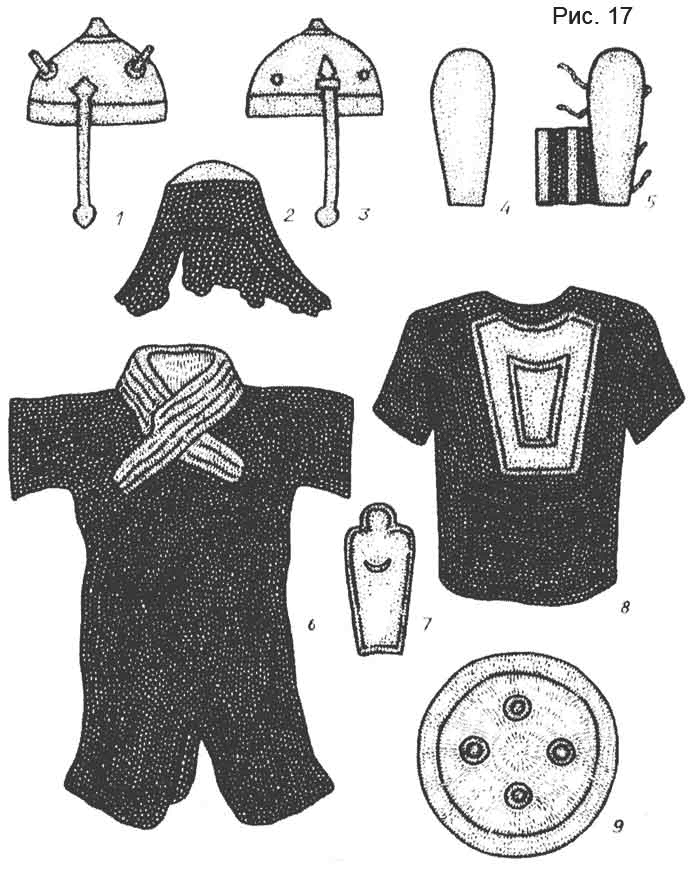 Вариант 2. Короткополые, без воротника. С зерцалом. Кольчуга с овальным проемом для головы, коротким неразрезанным подолом и широкой трапециевидной пластиной-зерцалом на груди (табл. 17: 8). Кольчуги с коротким подолом и широкой, массивной пластиной-зерцалом, также использовались конными воинами. Которые для защиты ног имели дополнительные средства защиты. Зерцало в виде широкой, трапециевидной формы пластины, сужающейся к нижней части с дуговидным вырезом наверху, повторяющим форму проема для головы у кольчуги, с двойным окаймляющим валиком, вероятно, было изготовлено специально для подобного варианта кольчужного доспеха (табл. 17: 8). Оно отличается по форме пластины от съемных прямоугольных пластин, крепившихся на ремнях или соединявшихся между собой, зафиксированных на позднесредневековых миниатюрах. Они напоминают широкие пластины для защиты корпуса и нагрудные пластины кирасы у иранских, турецких и индийских воинов эпохи позднего средневековья- начала нового времени [109].