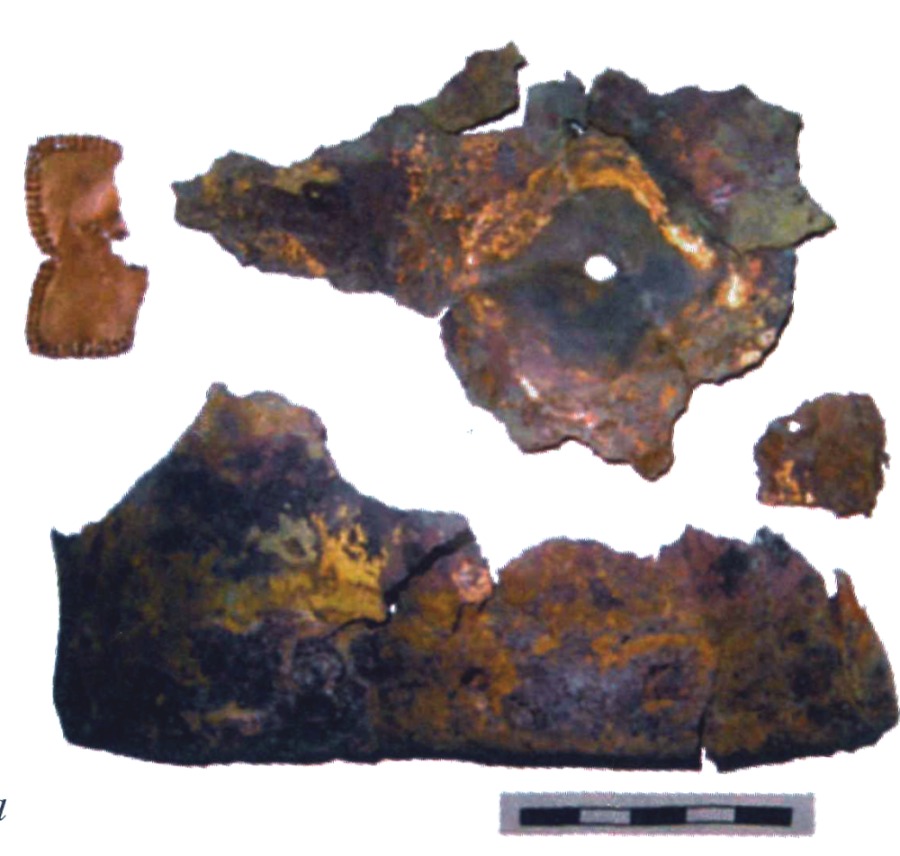 8 Консультация М. И. Петрова и С. Ю. Каинова, рисунок предоставлен Д. С. Коровкиным. Также использовалась работа студента исторического факультета Московского гос. университета Е. Е. Авдееенко. Предметы вооружения Людина конца Новгорода Великого по материалам Троицкого раскопа). По сообщению П. Г. Гайдукова, налобник датируется в рамках 1050—1070 гг. Отметим, что недалеко от этого предмета обнаружено втульчатое навершие шлема с остатками орнамента (Rybina Е. А. Gefunde als Spiegel des Lebens Alltag im mittelalterlichen Novgorod //Novgorod. Das mittelalterlichen Zentrum nid sein Umland im Norden Russland. Neumünster. 2001. Abb 3:3 auf Seite 202).
