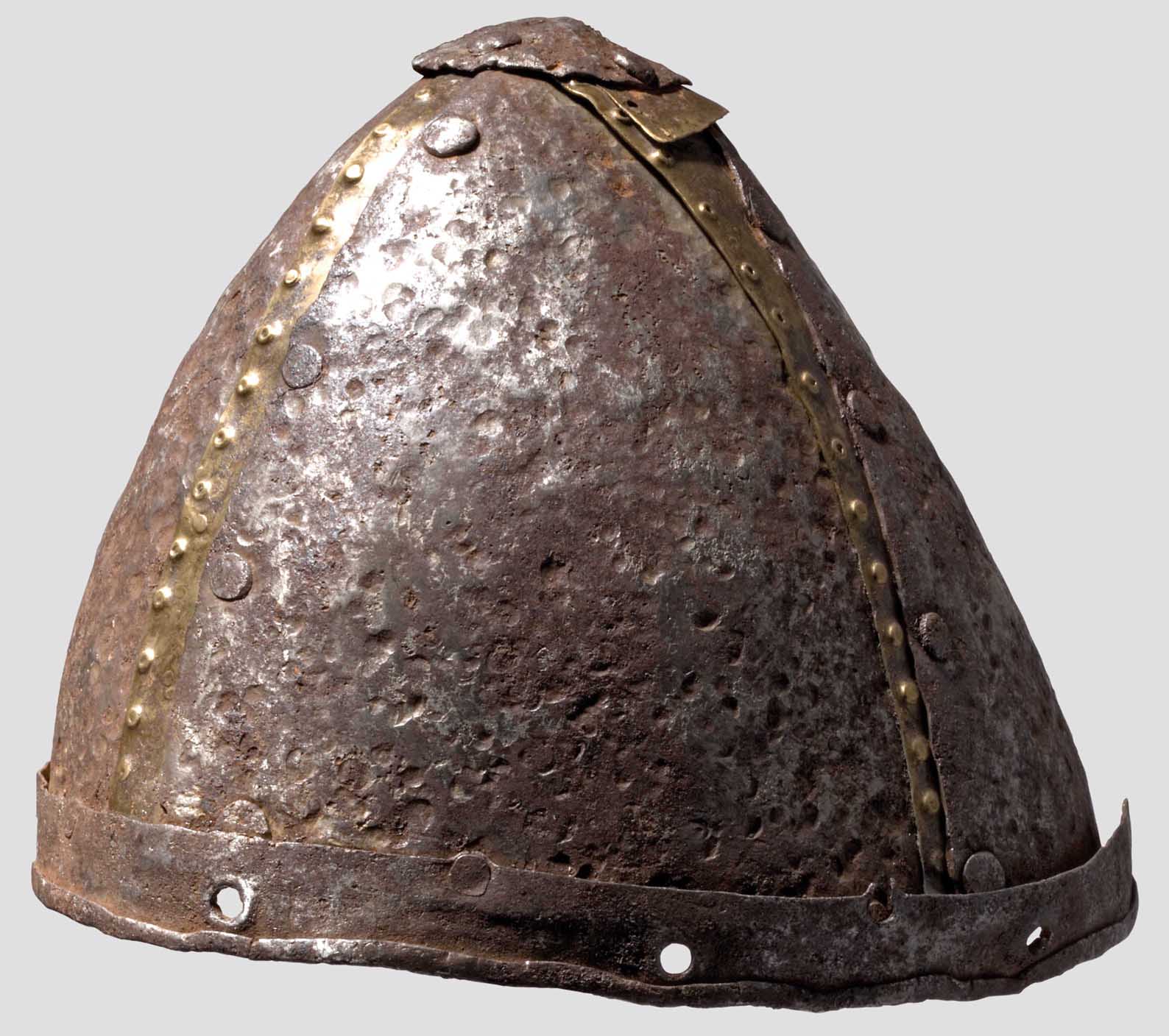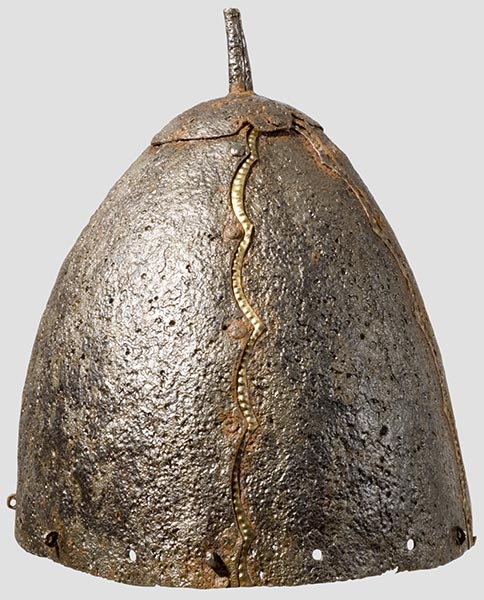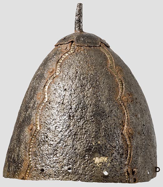 | Вот этот шлем: Венгерский (Мадьярский) 10-11 век. Коническая клепаная железная четырех лепестковая тулья. В фигурных поля пластин вставлены узкие, клепаные листы из бронзы с декоративным украшением в виде точек. Навершие приклепано на пятичастном диске. У основания шлема по ободу круглые отверстия и крепления для подвески бармицы. Очищен. Высота 22 см. Очень редкий тип шлема раннего средневековья. Аналогичный пример есть в коллекции археологического музея города Печ в Венгрии. См. Дэвид Николь. "Воины и их оружия во времена крестовых походов," Рисунок 8 c. Ссылка |