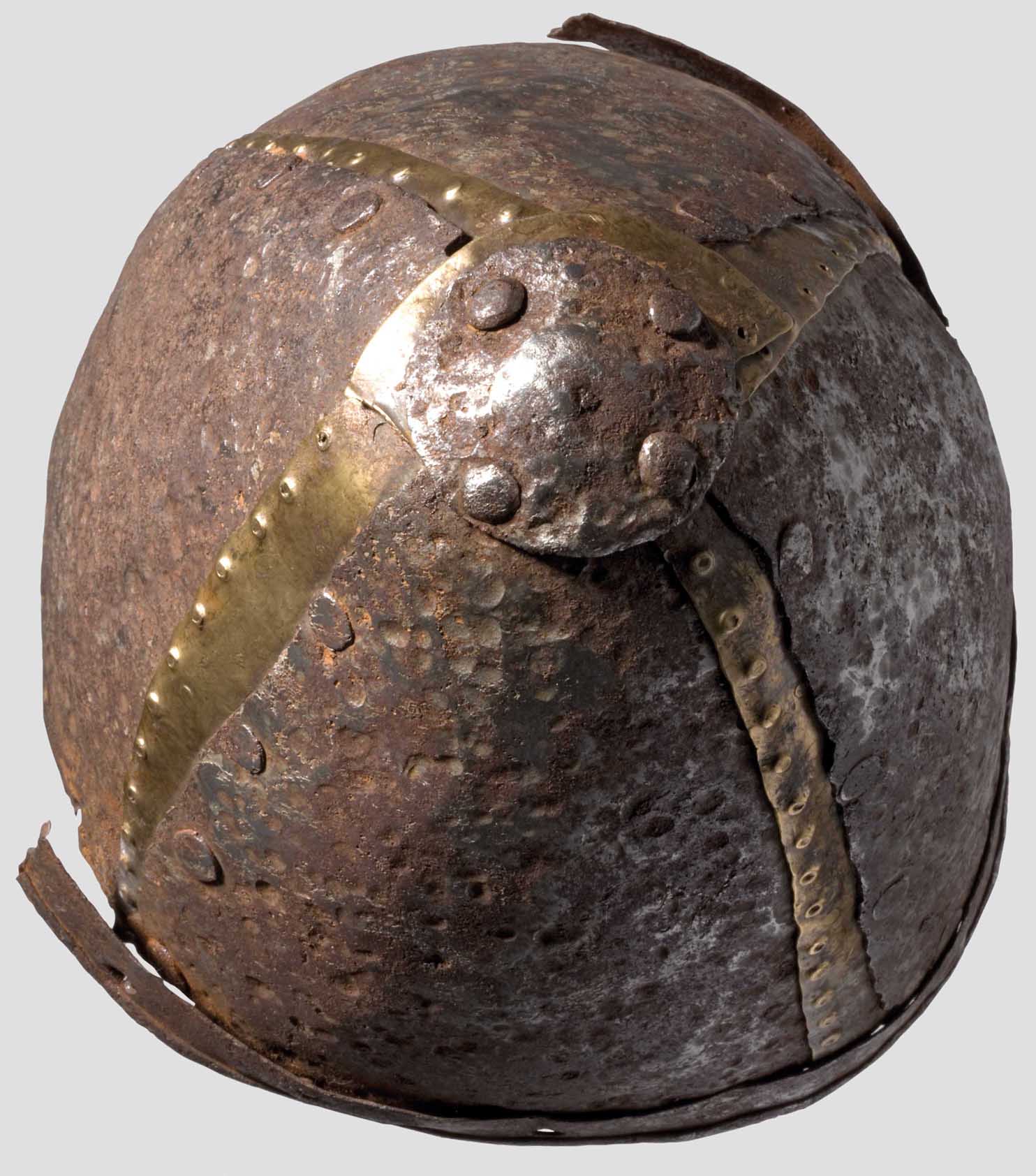 | Шлем недавно проявившийся на аукционе Hermann Historica, на момент публикации статьи в интернет он продавался за 20 000 €. Относится к 9th/10th веку. Высокая тулья, поднимается к круглой пластинке. Четыре сегмента прикованы друг к другу, с латунной полосой вставленной между швов. Пластинка, усиливающая группу лепестков, прикована вдоль нижнего края пробитой по периметру деформированной тульи с явными следами коррозии. Очищен. Высота 18 см. Ссылка |