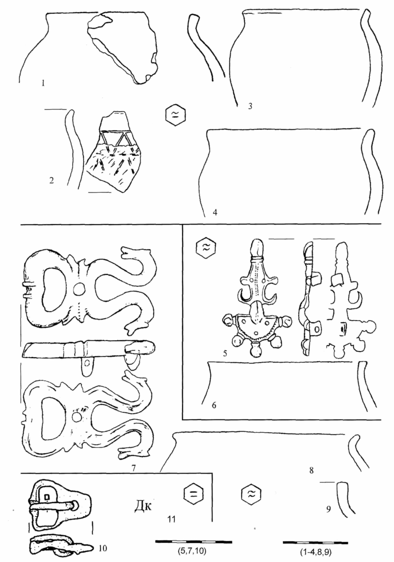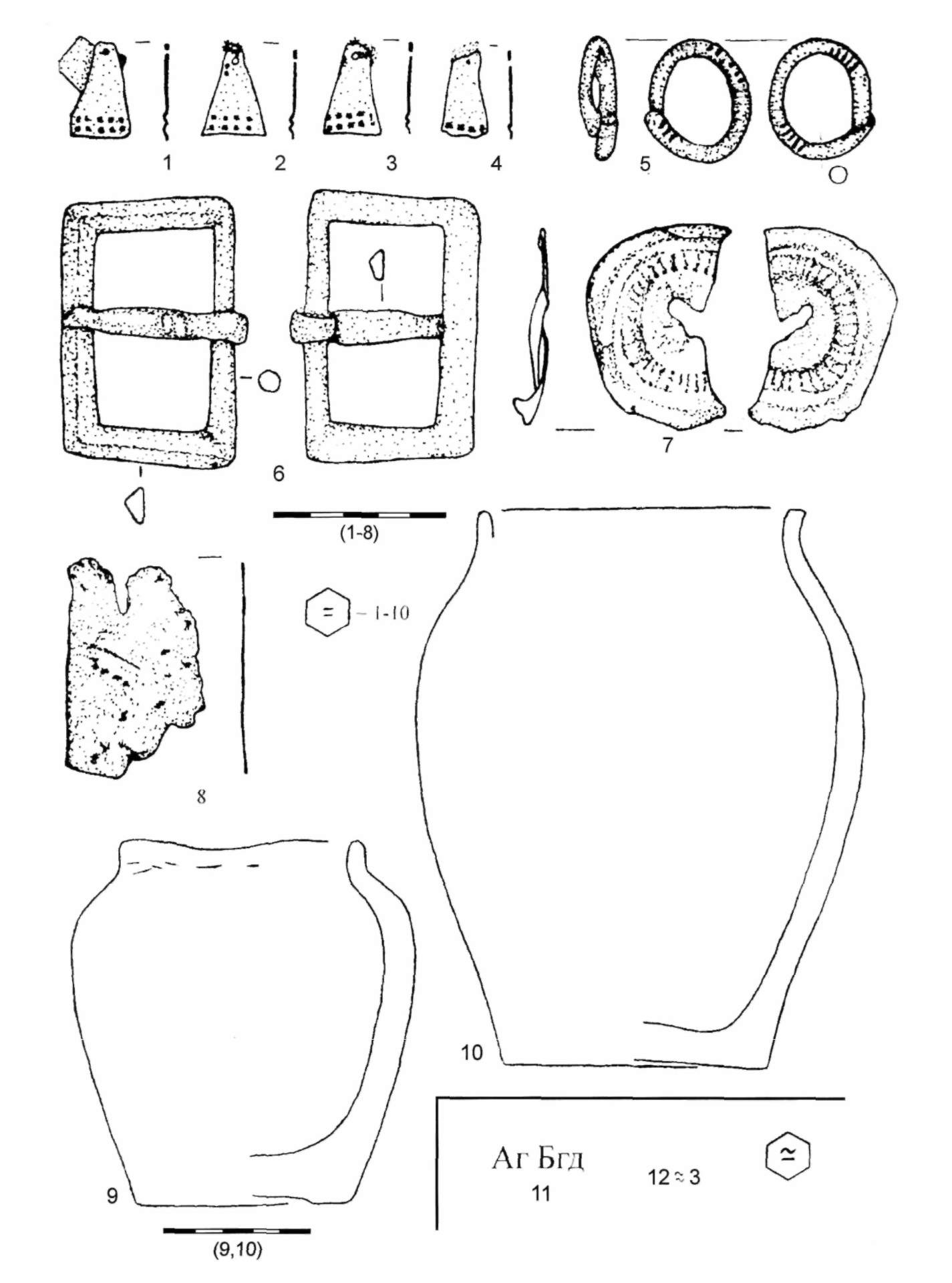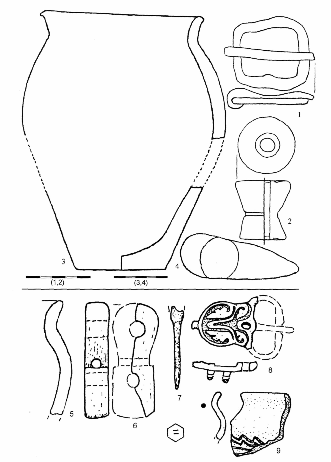 Язічок пряжки, керамика Пражская археологическая культура. Селиште, полуземлянка 2. Рис. 16. Будуряска, постройка В15. Славянская пряжка с орнаментированным щитком. 1-4 - Будуряска, постройка В15; 5-9 - Балта-Верде, погребение 1.