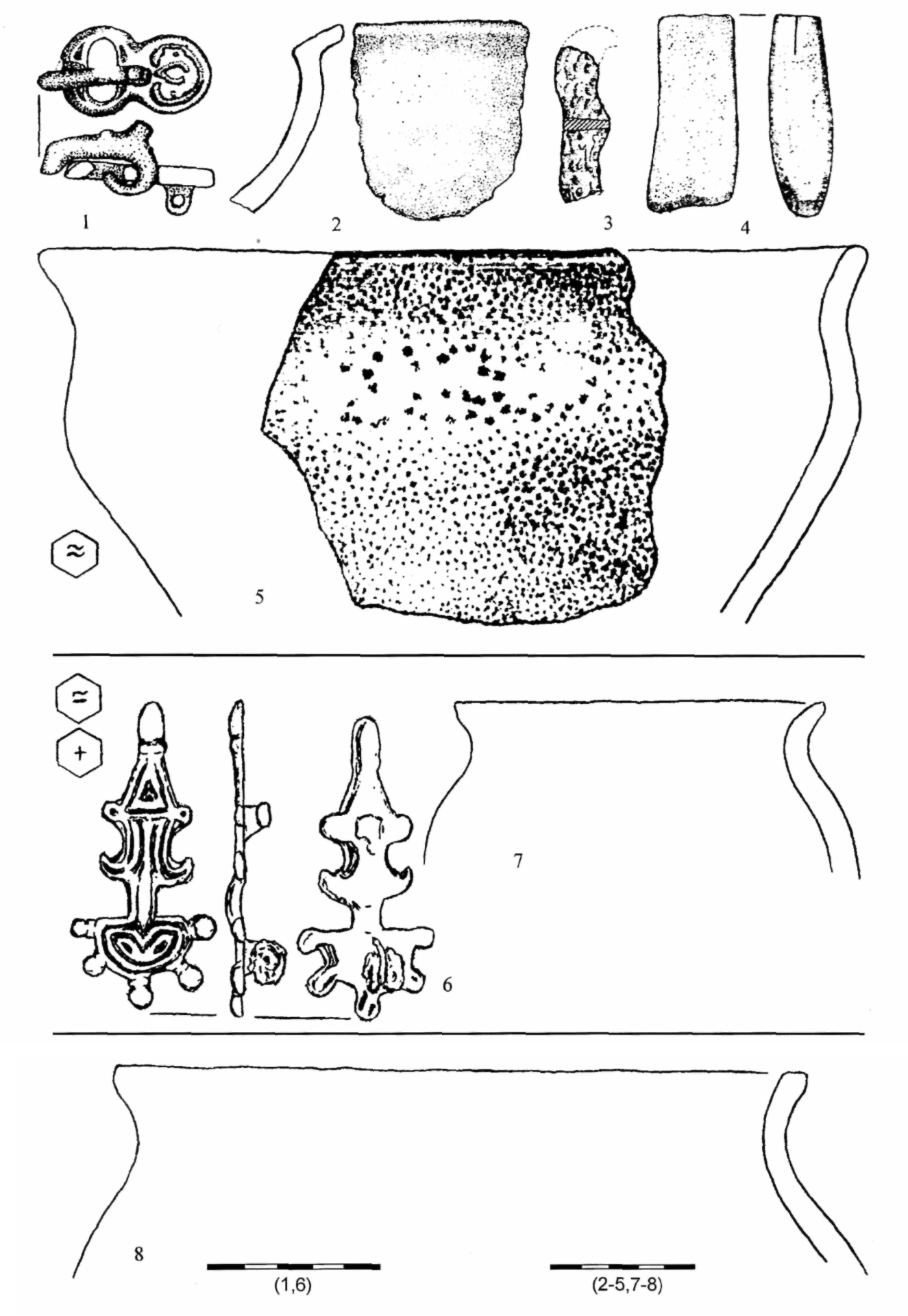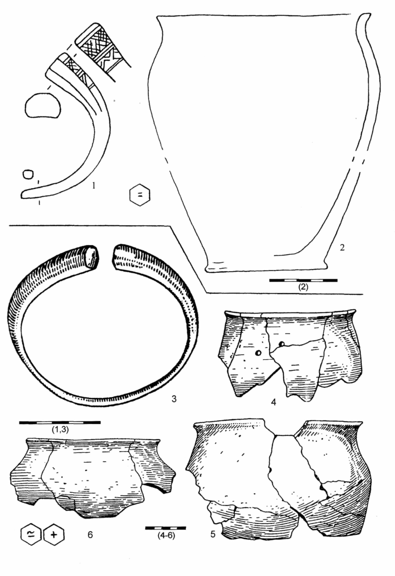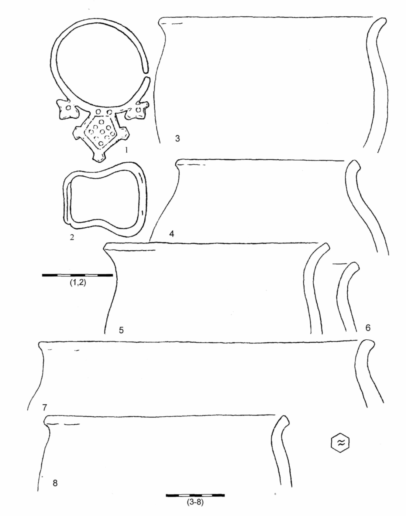 Пражская керамика известна и в комплексах с браслетами, имеющими массивные расширенные подграненные концы (рис. 24:1, 3). Аналогии этим вещам датируются довольно широко. Например, на могильнике Плинкайгалис в Литве схожие вещи массово представлены в комплексах как V, так и VI вв.3 Однако, в южной части Восточной Европы оснований для столь ранней датировки похожих вещей нет (некоторые из приведенных В. Д Бараном (1988, с. 22) аналогий отличаются по ряду деталей). Близкие находки в Поднепровье и Повисленье иногда встречаются в неясном для датировки контексте, например в Шелигах, Зимно (см. о них приложение к каталогу), в Максимовке (И. О. Гавритухин 2004). Есть подобные браслеты и в составе днепровских кладов (см. список по И. О. Гавритухин, А. М. Обломский 1996, рис. 63 и публикации по Г. Ф. Корзухина 1996). Причем, браслеты с чуть уплощенными орнаментированными концами (как рис. 24:1) представлены лишь в днепровских кладах группы 1 (типа Мартыновского, датируемых около 2-й -3-й четверти VII в. по И. О. Гавритухин, А. М. Обломский 1996). Не орнаментированные шестигранные браслеты (как рис. 24:3) известны как в тех же кладах, так и в более поздних (например в Харьевском).