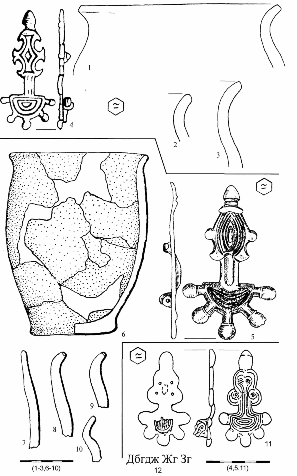 Пальчатые фибулы из Рашкова, Демьянова, Великой Слободы, Сучавы-Шипот, Черновки, Ханска (рис. 19:5; 21:4, 11; 22:1; 23:8) принадлежат различным вариантам днестро-дунайской подгруппы поствосточногерманских пальчатых фибул. В специальной работе я датировал такие вещи в рамках VII в., исключая самое начало и конец этого столетия (И. О. Гавритухин 1991). Неясность проблемы происхождения и контекст комплекса из Бернашовки (см. выше) позволяют отнести нижнюю границу некоторых типов к последним десятилетиям VI в. или рубежу VI и VII вв. Совместная находка фибулы типа Марош-Гымбаш-Пергамон и пряжки типа Сучидава в погребении 113 могильника Братей 3 (L. Barzu 1991 ) указывают на наиболее вероятную датировку комплекса около последних десятилетий VI в. Что так же является аргументом в пользу удревнения нижней границы предлагавшихся ранее хронологических рамок. Остальные введенные в научный оборот материалы не дают оснований пересматривать предложенную дату по существу2.