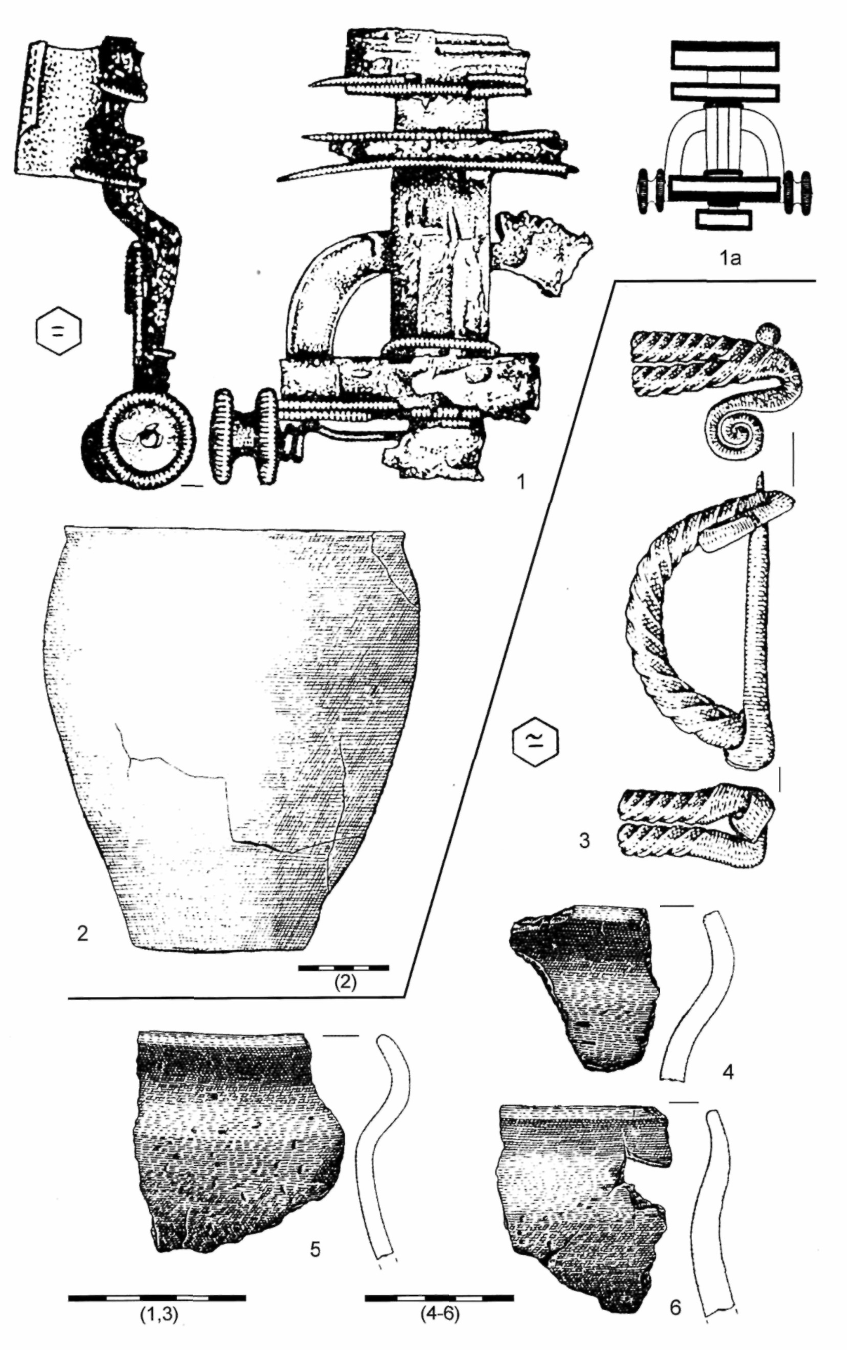 В целом, шестигранные браслеты с неорнаментированными концами являются довольно широко распространенным типом. Однако, можно легко указать целый ряд синхронных памятников и культур, где при значительной выборке браслетов такие вещи не известны. Сравнительно не много аналогий известно и браслету из Рашкова (рис. 24:1). Таким образом, при суммарном подходе интересующие нас браслеты едва ли могут быть надежными хронологическим реперами. Но, вероятно, это станет возможно, если учитывать культурную и локальную специфику распространения этих вещей. Однако, такая работа для браслетов Восточной и Центральной Европы еще не сделана.