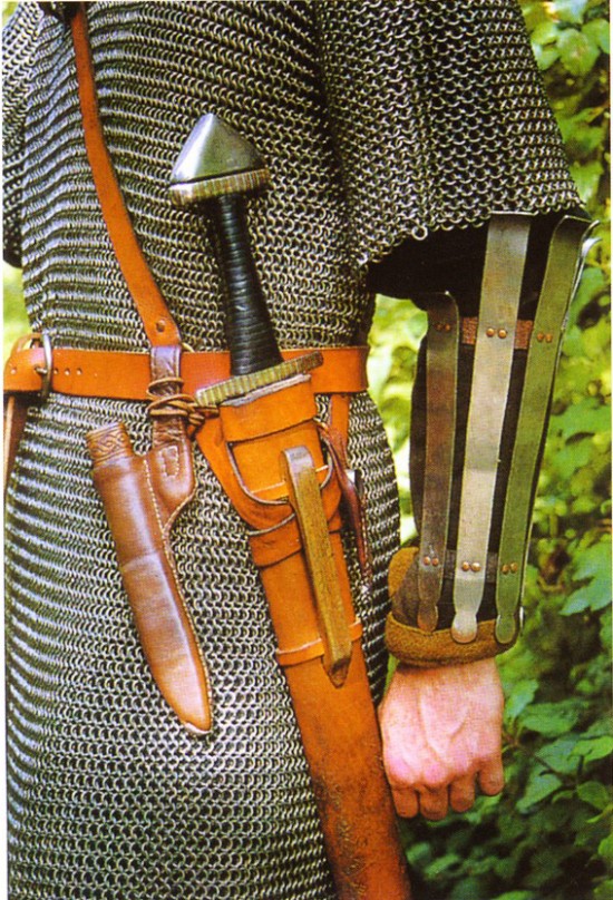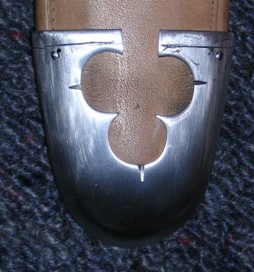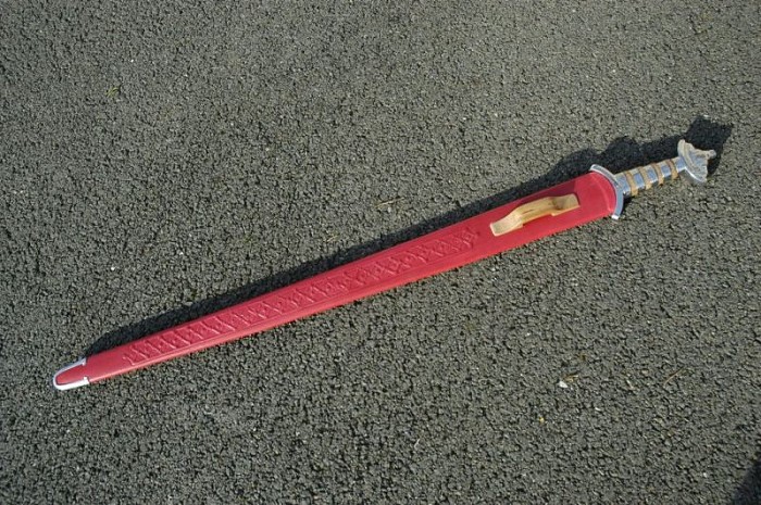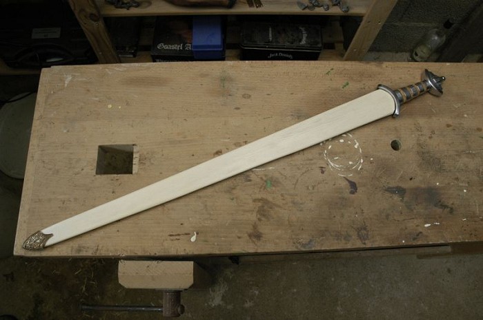 | Что интересно в конце вместо дорогого наконечника ножен по образцу найденного у Гьермундбю, был одет простой. Потому что красивый, впоследствии, не налез. Обратите внимание на "дверную ручку" на ножнах, в ранние периоды она использовалась для подвешивания ножен меча. Как это выглядело | |