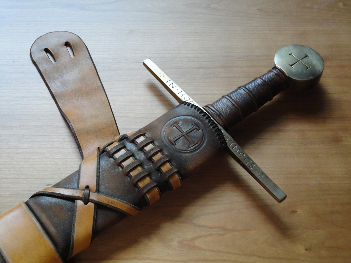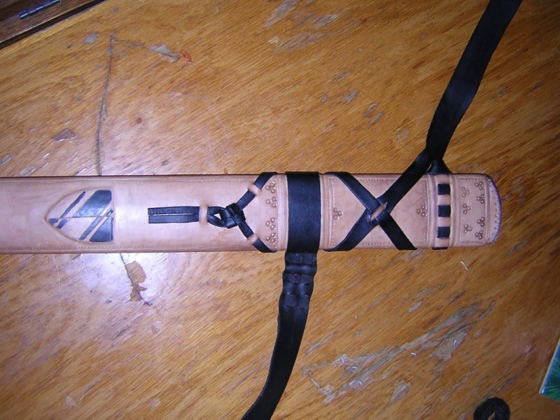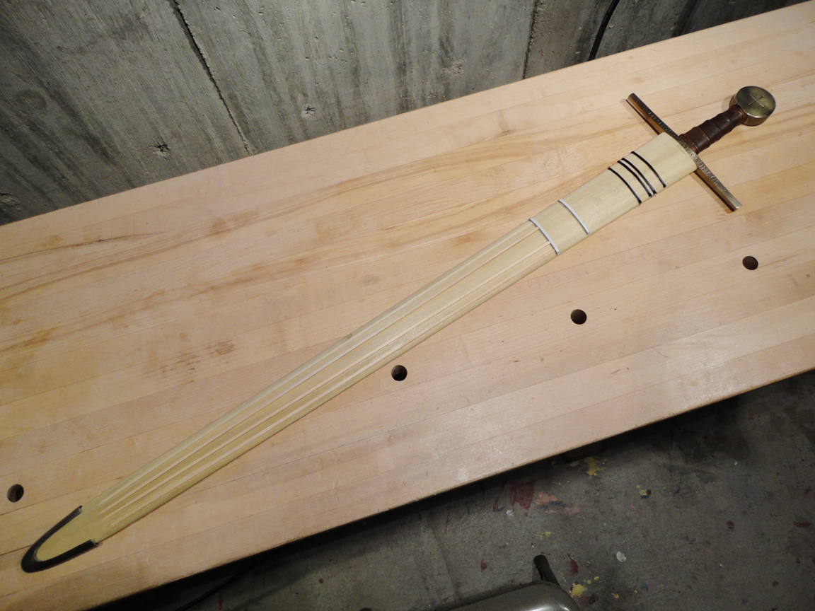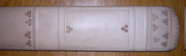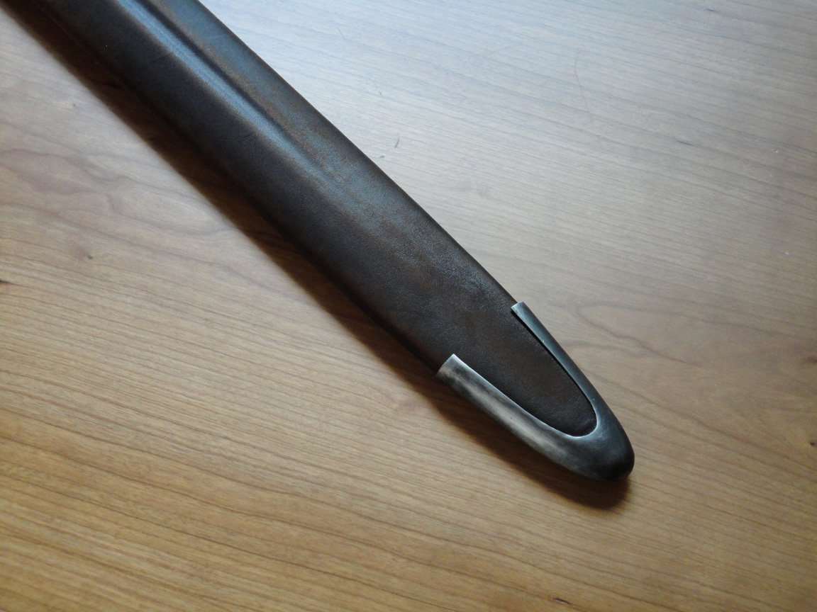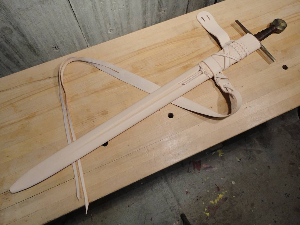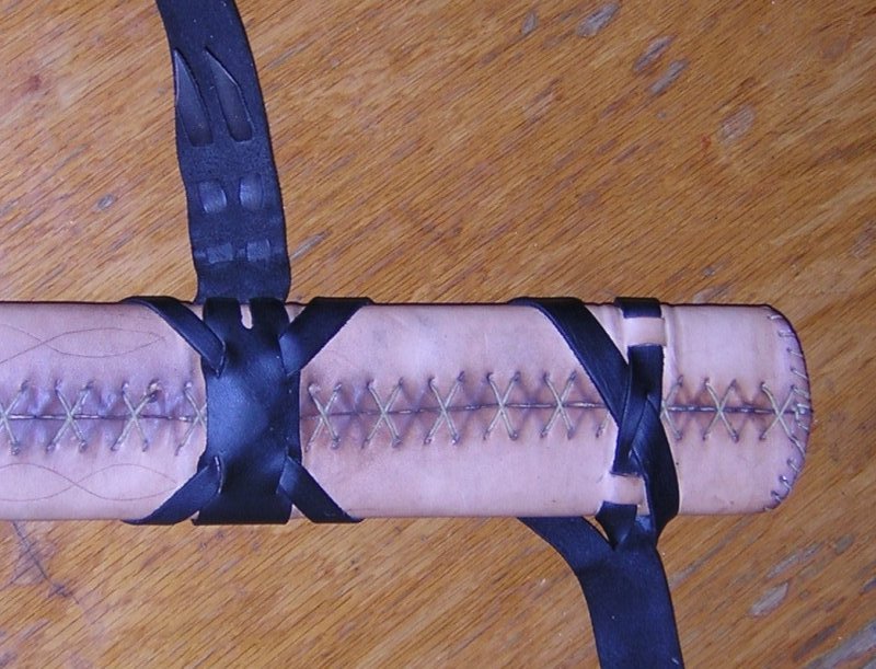 Для прочного склеивания деревянных половинок ножен наружная поверхность деревянной основы ножен была покрыта клеем и обтянута тонкой хлопчатобумажной тканью (старой простыней). Далее была использована коровья кожа толщиной 1,5 мм. С обратной стороны кожа сшивалась накрест, при этом отверстия пробивались шилом в 5 мм от края и использовалась толстая льняная нить которую Al Muckart использует при изготовлении обуви. Маленькие точки были продавлены тупым шилом по горячей и слегка влажной коже. Кружочки выдавливались отрезком трубки, темный цвет кружочка был получен благодаря оксиду железа (ржавчине?).