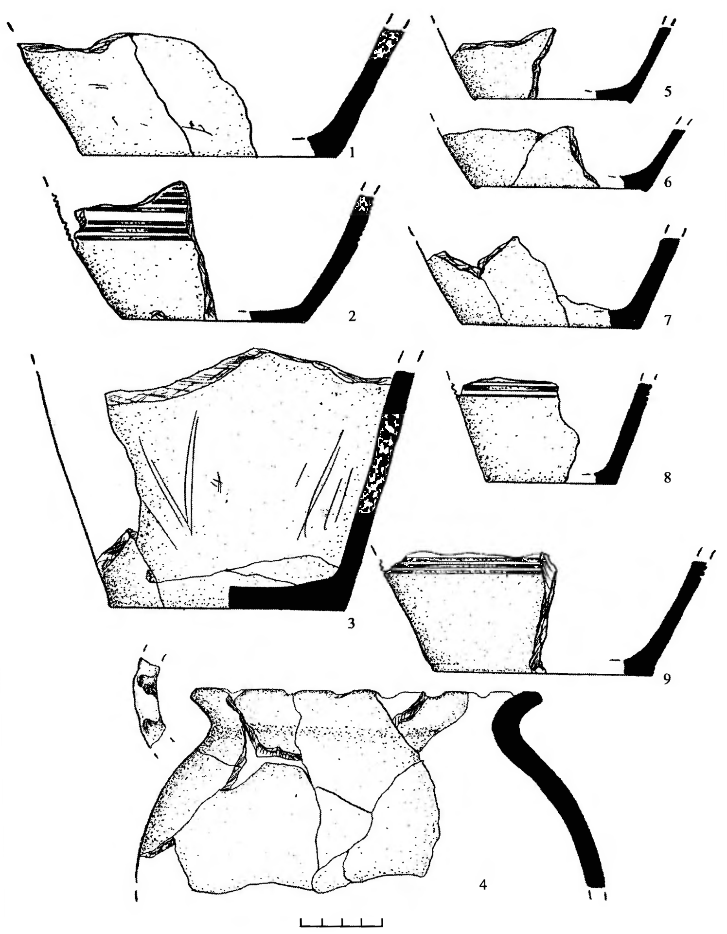 Сидоровское городище. Раскоп 7. Фрагменты сосудов: 1, 2, 8, 9 — хоз. яма 8; 3-4 — хоз. яма 5; 5-6 — хоз. яма 2; 7 — хоз. яма 1. Сидоровское городище. Раскоп 7. Лощеная посуда: 1, б, 8, 9 — хоз. яма 8; 2,7 — хоз. яма 1; З — помещение 8; 4 — хоз. яма 5; 5 — хоз. яма 4. Сидоровский археологический комплекс. Лощенная посуда: 1 — раскоп 9, хоз. яма 5; 2 — раскоп 9, хоз. яма 7; 3, 5-раскоп 12. помещение 11; 4 — раскоп 9, квадрат Л 6.