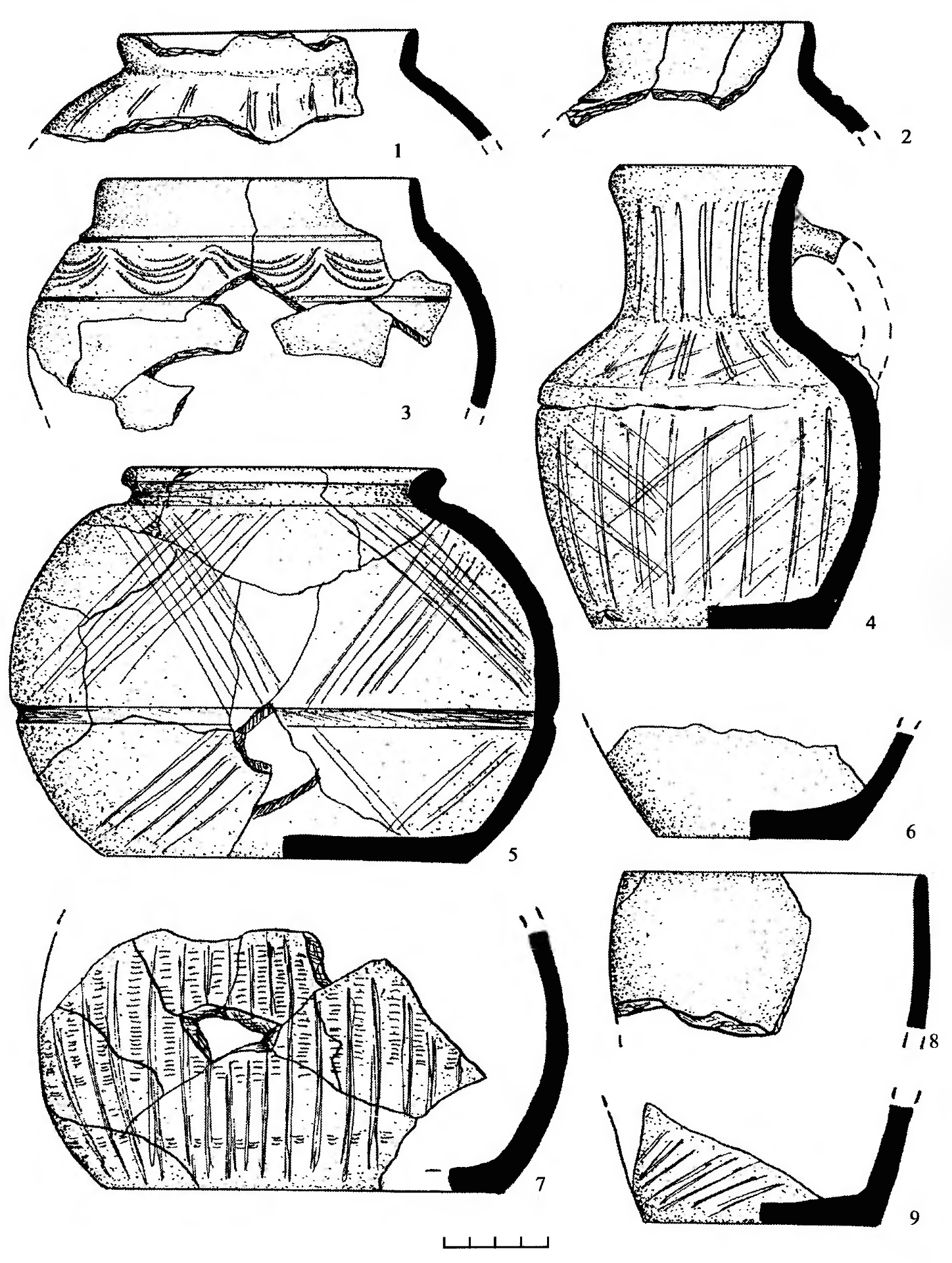 Лощеных сосудов немного. Представлены они обломками стенок сероглиняных крупных корчаг или пифосов, украшенных вертикальными про-лощенными линиями, а также обломками стенок кувшинов. В целом комплекс имеет мало отличий от поздних материалов раскопов 2-7 и, наиболее вероятно, одновременен им.