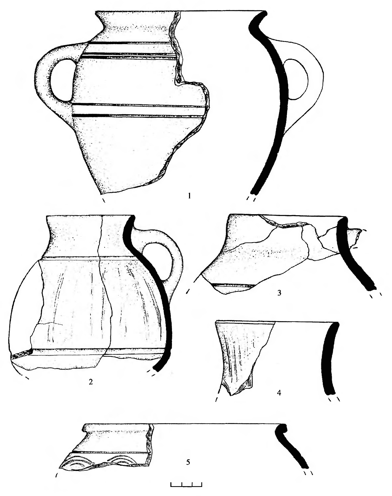 В северо-восточной части ямы, на уровне -1,1 м от СП лежал на боку целый (с отбитой ручкой) кувшин, орнаментированный по корпусу проло-щенной косой сетчатой штриховкой (рис. 29, 4). Обломки такого же кувшина ранее были найдены в 2000 г в хозяйственной яме 6 раскопа 1.