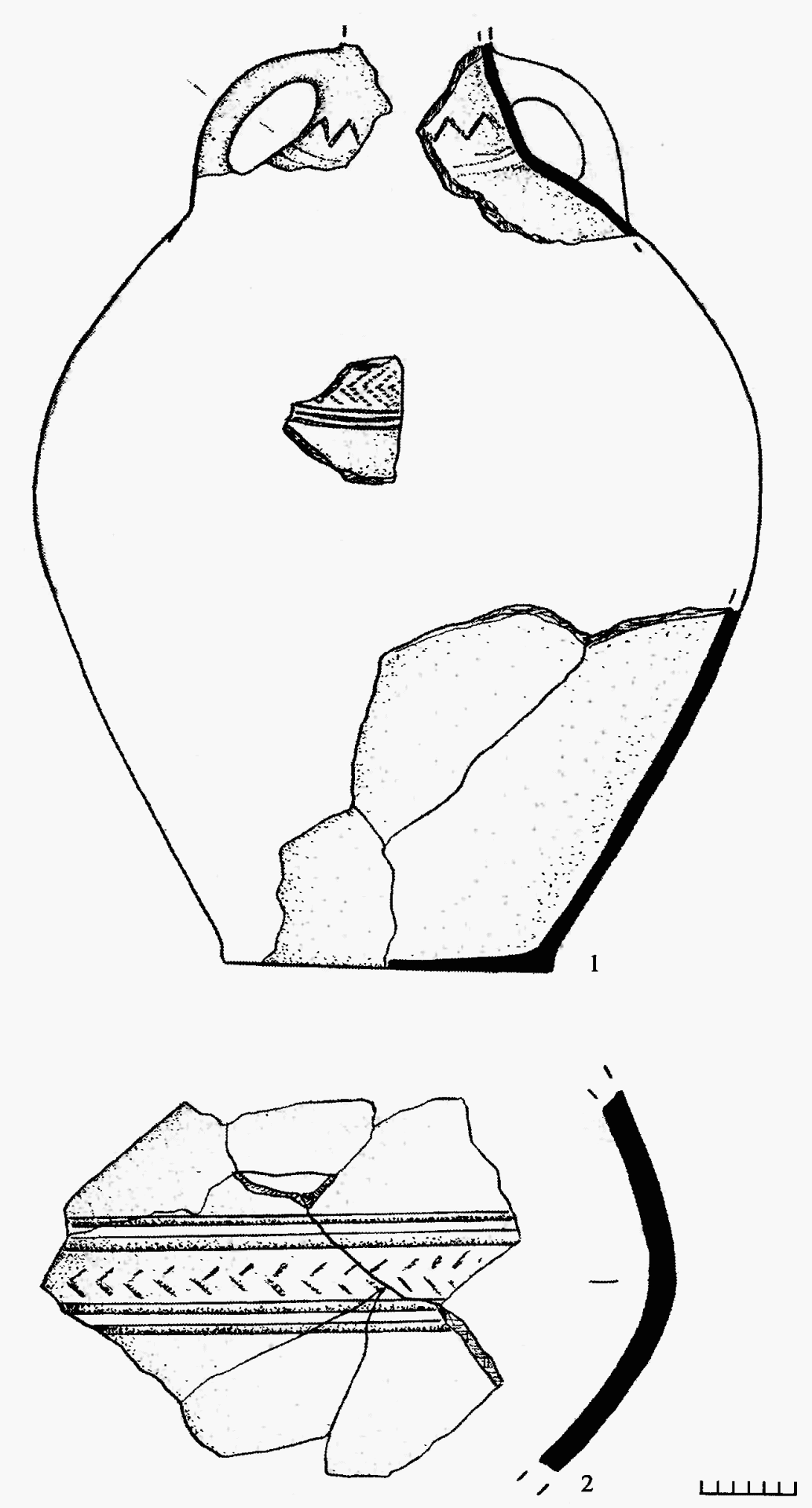 Лощеной керамики меньше. Она представлена крупными фрагментами небольших кувшинов, орнаментированных по корпусу комбинациями линий или сетчатым рисунком. Среди лощеной керамики выделяются фрагменты крупных гончарных сероглиняных пифосов. Судя по венчикам, в заполнении хоз. ямы 4 содержались обломки как минимум двух таких сосудов (рис. 34, 1, 2). Один из них был украшен по корпусу пролощеными вертикальными линиями, прерывающимися в центральной части сосуда широким поясом из дуг, образующих горизонтальную многорядную волнистую линию (рис. 34, 1). Кроме этих находок, есть фрагмент крышки с высокой ручкой.