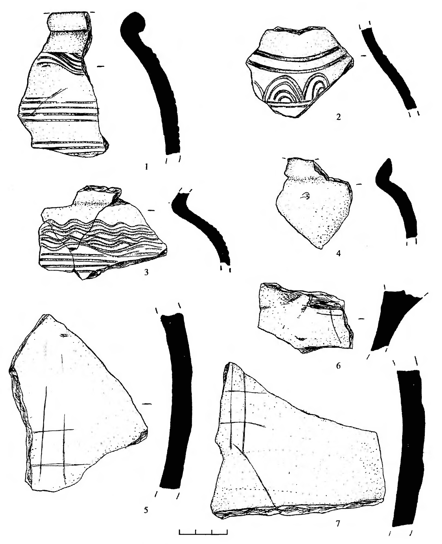 Фрагменты крупных сосудов: 1, 2 — раскоп 7, хоз. яма 4; 3 — раскоп 9, хоз. яма б, скопление 1. Фрагменты керамики и железные изделия (6-7): 1 — раскоп 9, слой; 2-5 — подъемный материал; 3 — раскоп 12, помещение 11; б — раскоп 10, верхний слой; 7 — раскоп 10, хоз. яма 3. Раскоп 7. Фрагменты керамических сосудов: 1-3 — хоз. яма 1; 4, б — хоз. яма 4; 5,7 — скопление в квадратах X 8-9.