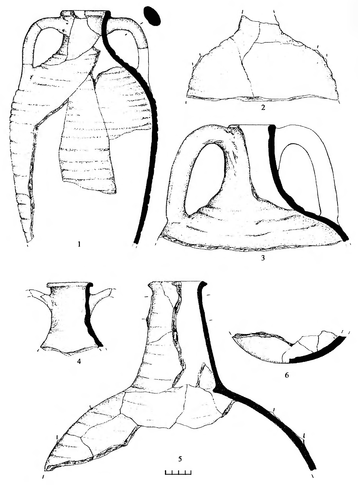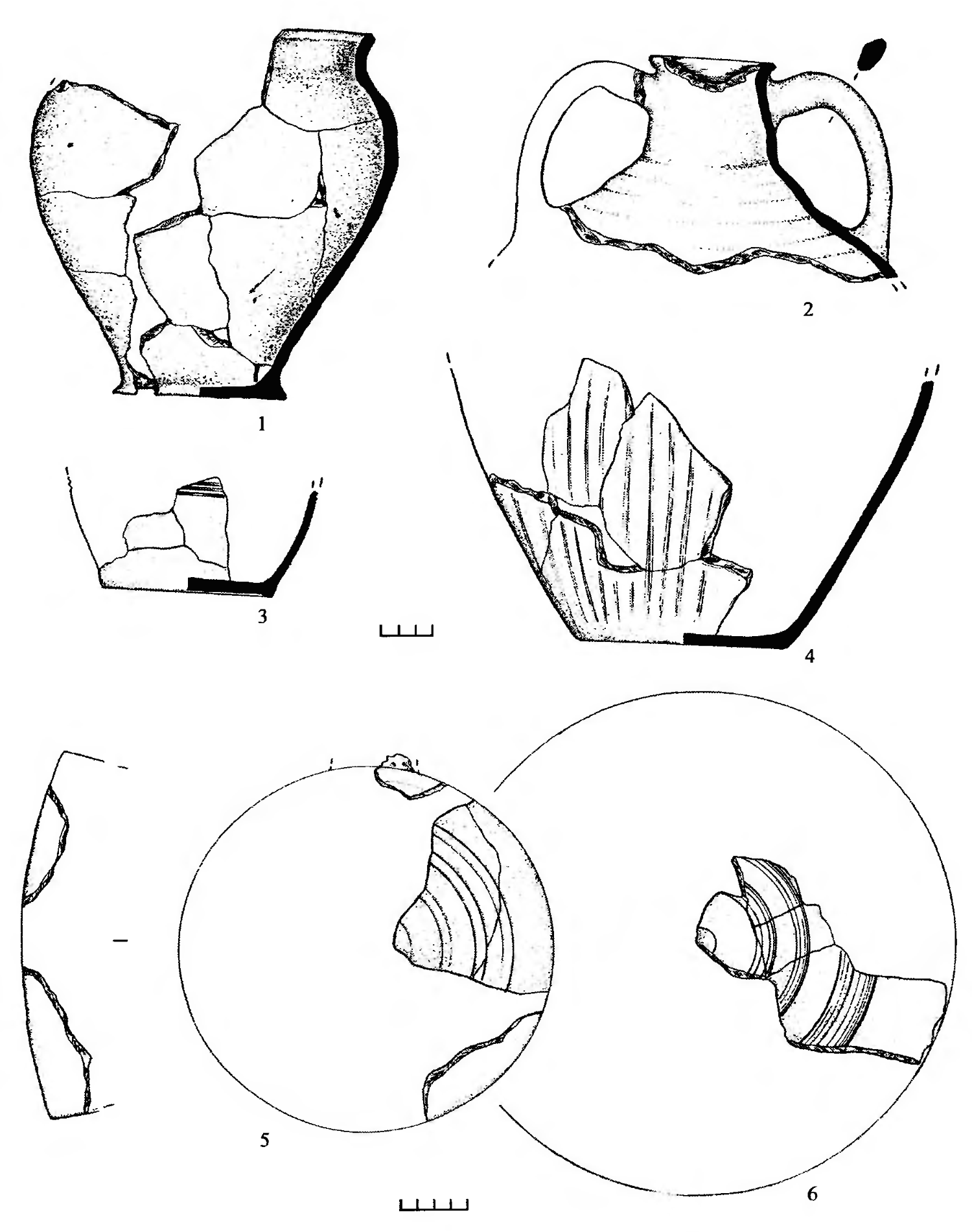 Амфорная тара представлена исключительно обломками амфор 2-го типа, идентичных большинству подобных сосудов, обнаруженных в сооружениях раскопов 1, 2, 5, 7. Среди кухонной керамики – обломки гончарных горшков с полосчатым рифлением по корпусу (рис. 20, 3, 5; 21, 3, 9; 24, 5). Некоторые из них имеют дополнительную орнаментацию в виде полосы многорядной “волны” на плечиках. Иногда встречается украшение края венчика или внутренней его стороны нако-лами, выполненными при помощи гребенчатого штампа.