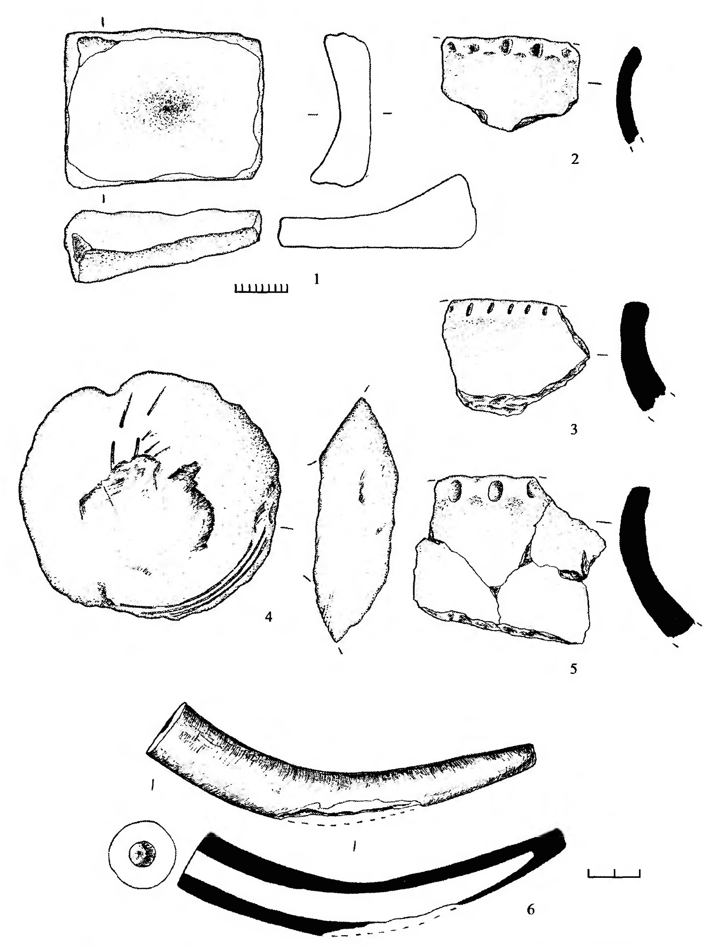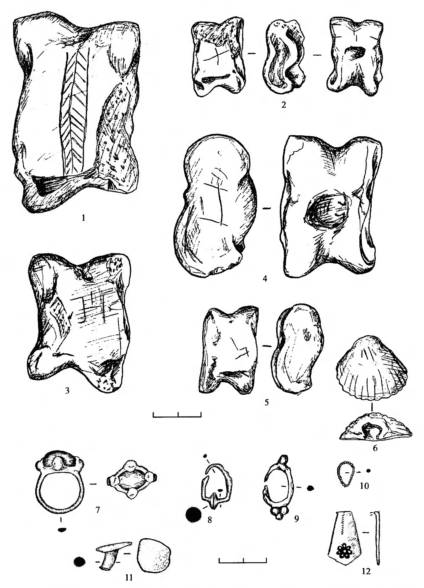 Среди прочих находок привлекает внимание группа астрагалов, обнаруженная в юго-западном секторе ямы. Астрагалы (19 крупных копытных и 3 мелких копытных) лежали компактной кучкой практически у дна ямы. Несколько астрагалов лежало в восточном ее секторе. На трех астрагалах крупных копытных имеются изображения. На одном — это тамгообразная фигура, вырезанная на щитке острым инструментом (рис. 45, 5). На другом — щиток пересекает продольная полоса “елочного” орнамента, заключенная между двумя линиями (рис. 45, 1). На боковой части третьего изображена прочерченная П-образная фигура (рис. 45, 4). На щитке маленького астрагала процарапан крест (рис. 45, 2).