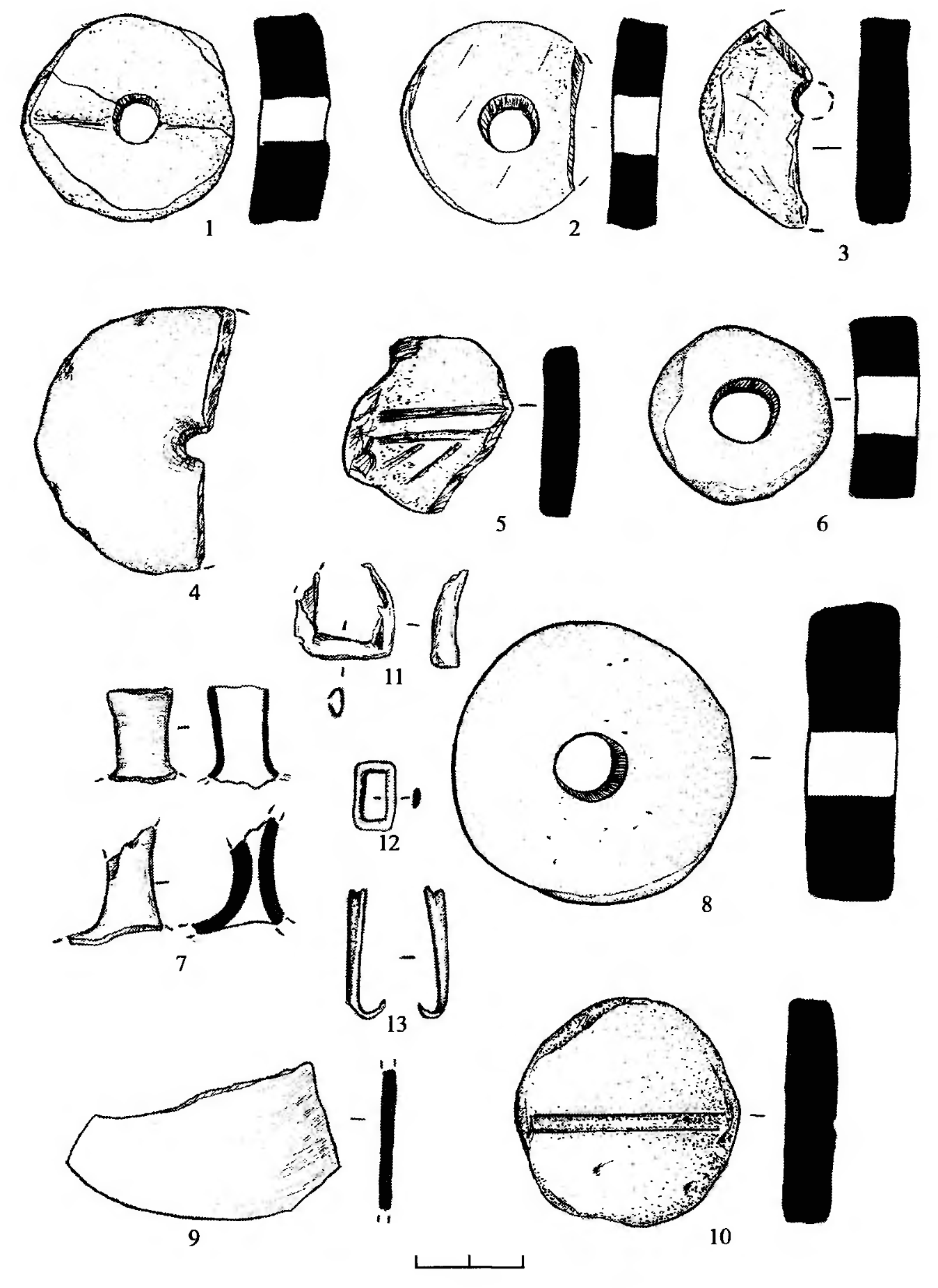 Рис. 40. Сидоровское городище. Раскопы 9-10. Каменная зернотерка (1), роговая заготовка (6) и фрагменты керамики: 1 – раскоп 9, помещение 10, яма; 2, 3, 5 – раскоп 9, слой; 4 – подъемный материал; б – раскоп 10, слой.  Рис. 41. Сидоровское городище. Керамические (1-6, 8,10), стеклянные (7, 9) предметы и изделия из цветных металлов (11-13): 1-2 — раскоп 7, хоз. яма 2; 3 — раскоп 7, хоз. яма 8; 4 — раскоп 9, А 7-8; 5 -раскоп 7, хоз. яма 1; 6 — раскоп 9, помещение 10; 8 — раскоп 9, квадратД9; 10, 13 -раскоп б, помещение 5; 7,9 — раскоп 9, помещение 10, дно; 11 — раскоп 5, погребение 1; 12 — подъемный материал.  Рис. 42. Сидоровский археологический комплекс. Железные предметы: 1 — Средний Яр, подъемный материал; 2 — раскоп 9, квадрат Д5; 3 — раскоп 10, квадрат Е 7; 4 — раскоп 10, квадрат Е 8; 5 — помещение 7; 6, 8 — раскоп 7, помещение 8; 7 — раскоп 10, верхний слой; 9 — раскоп 7, хоз. яма 2.