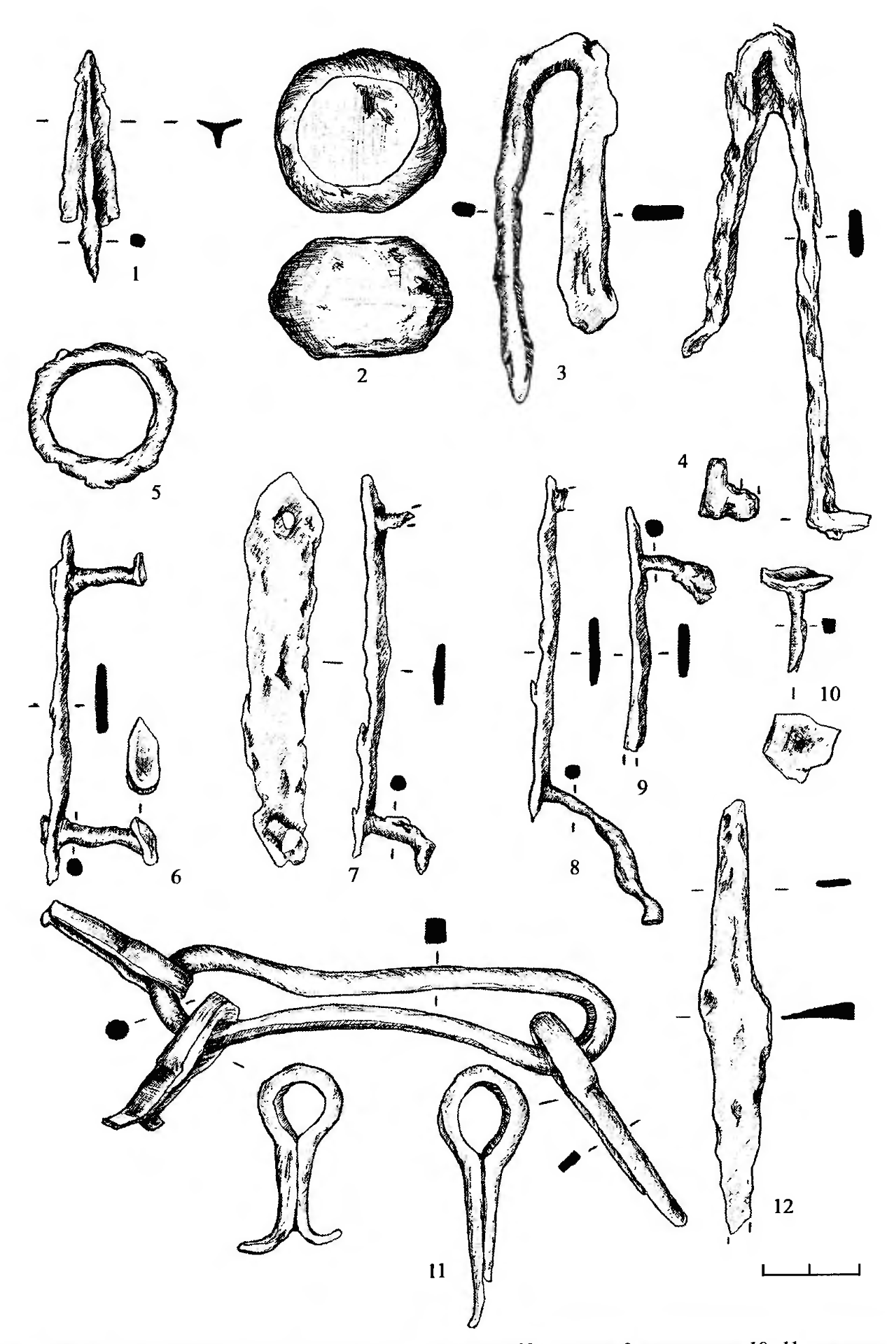 Сидоровское городище. Железные предметы: 1-10-раскоп 9, помещение 10; 11 -раскоп 9, квадрат Л 6; 12 -раскоп 9, помещение 9. Сидоровское городище. Железные предметы. 1-2 — раскоп 9, квадрат И 4; 3 — раскоп 12. помещение 11; 4 — раскоп 9, квадрат К-6; 5 — подъемный материал; 6.9, 10 — раскоп 6. помещение 5; 7 — раскоп 9, квадрат М-6; 8 — раскоп 6, хоз. яма 1. Рис. 45. Сидоровское городище. Астрагалы со знаками и украшения: 1-5 — кость; 6 — раковина; 7-9, 11-12 — бронза; 10 — золото.
