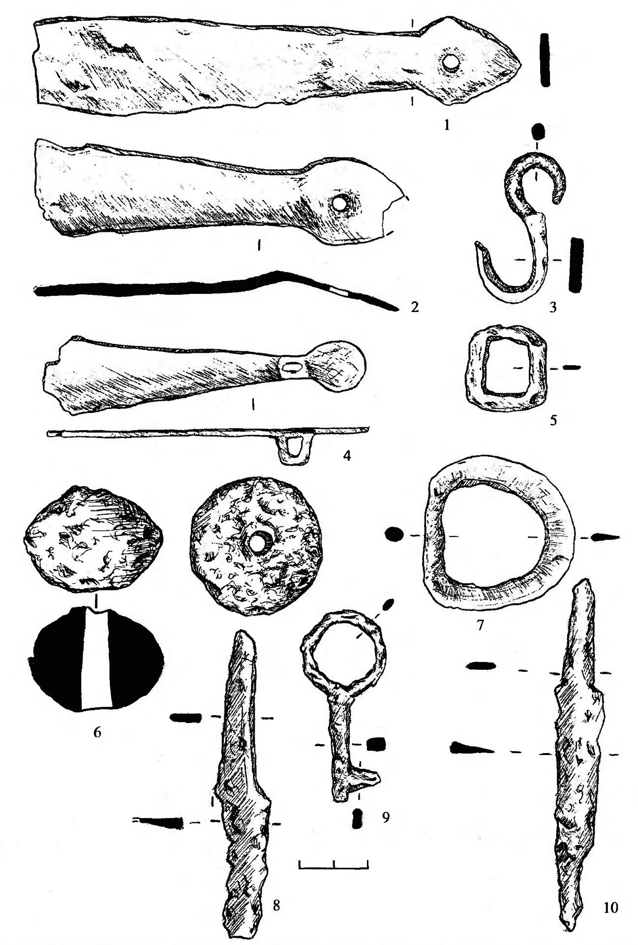Помещение 8. Обнаружено в восточной части раскопа (рис. 3; 7; 11, 2, 5; 69; 70). Равномерное гумусное заполнение котлована постройки было практически лишено находок. Все предметы, найденные в помещении, обнаружены в нижней его части у дна (уровень -1,2-1,35 м). Среди них фрагменты лощеного сосуда со слегка сужающимся кверху коротким прямым венчиком (рис. 29, 3) и железный пластинчатый ключ (рис. 42, 6).