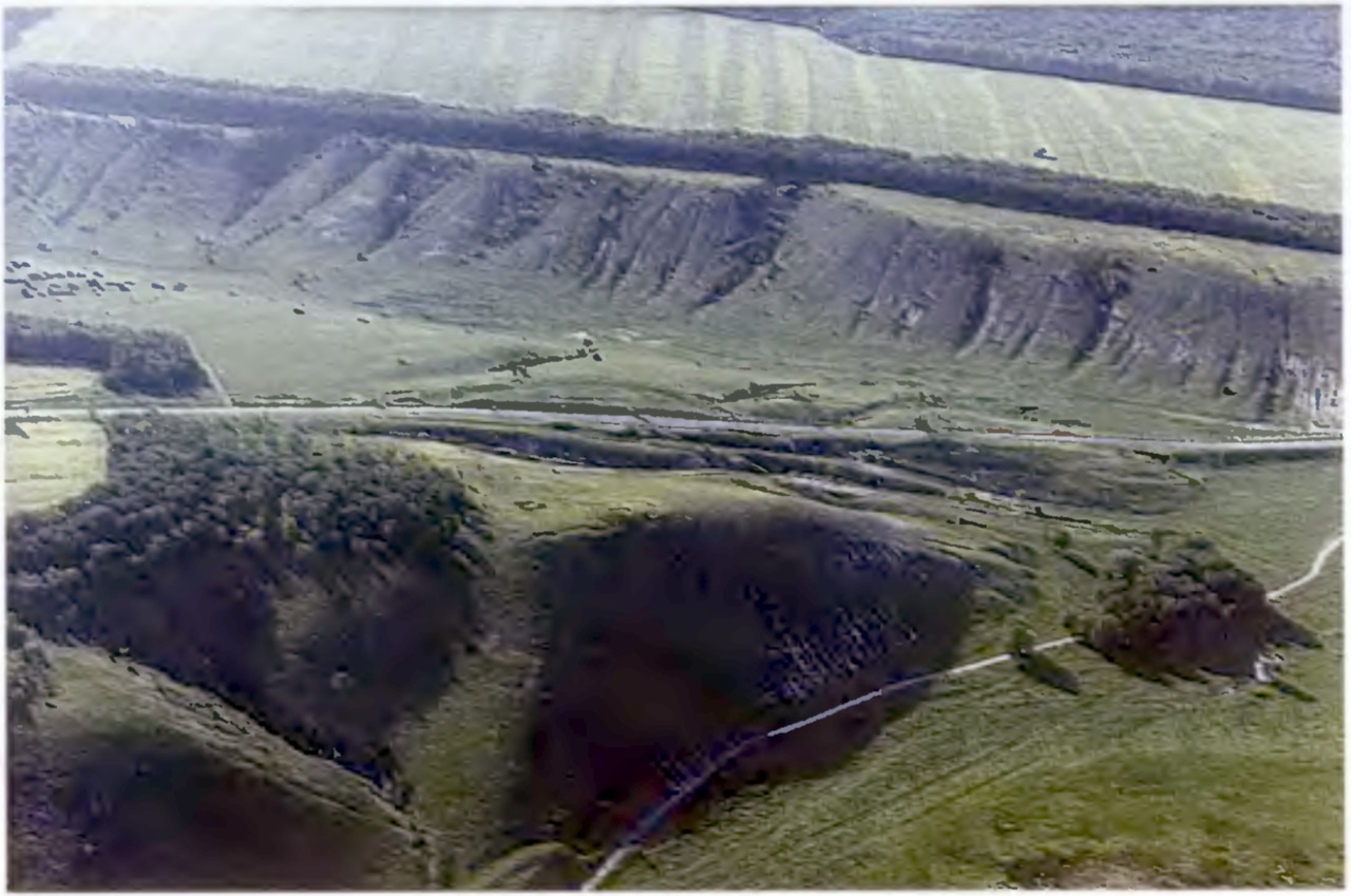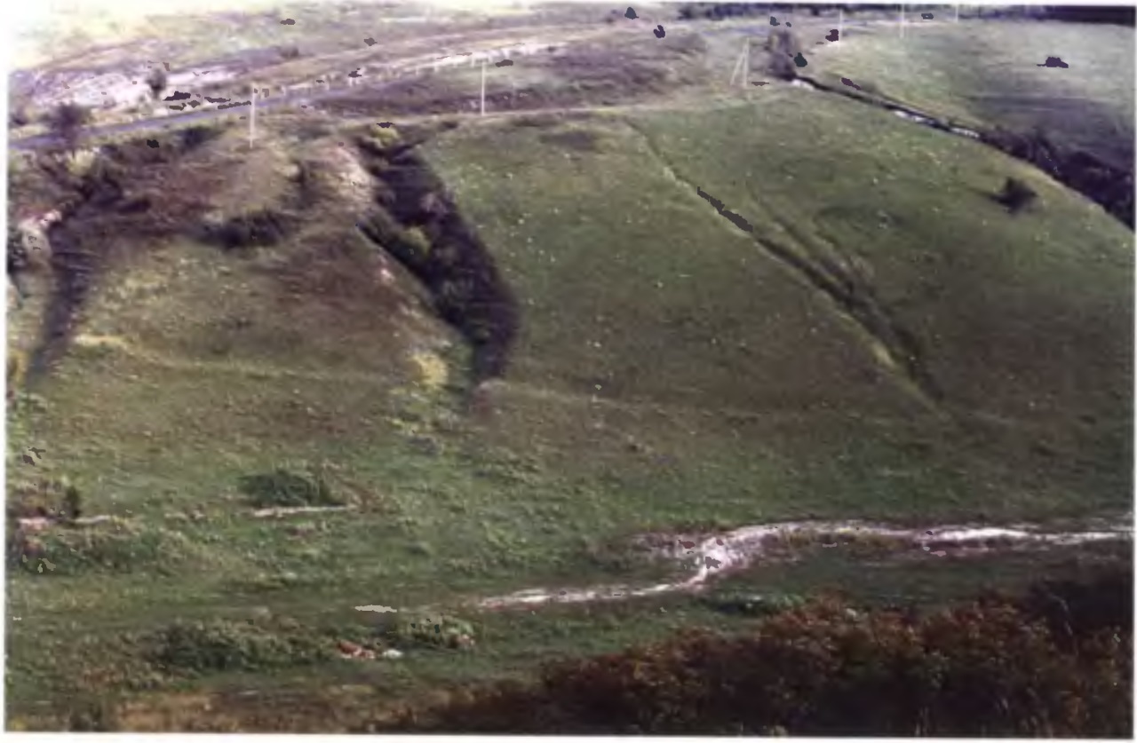 Рис. 59. Сидоровское городище. Вид с юго-востока (с воздуха). Стрелкой показана врезанная в склон древняя дорога, идущая на памятник.  Рис. 60. Вид с южной окраины городища на противоположный северный склон Сидоровского яра. Видна врезанная в склон древняя дорога.