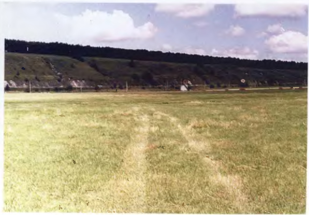 Рис. 61. Вид на городище с востока из поймы. Стрелками показан эскарп.  Рис. 62. Могильник І. Вид на раскоп 11 с юга.