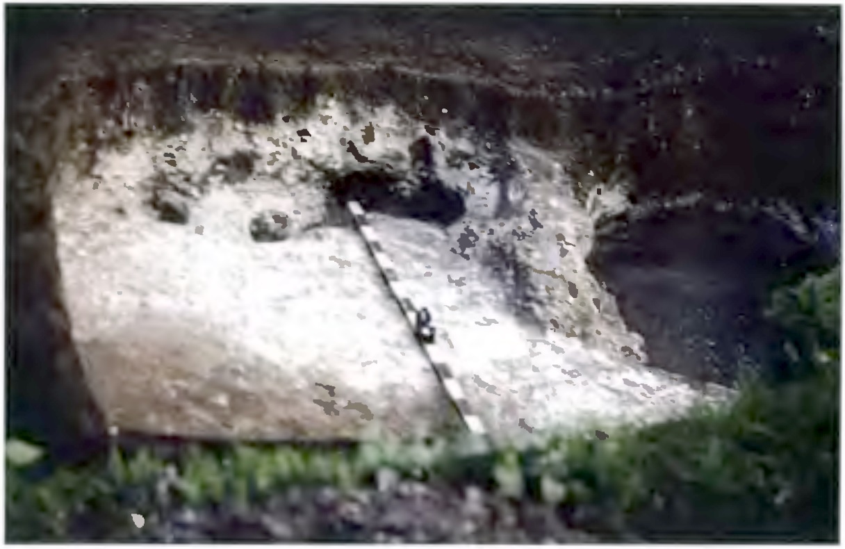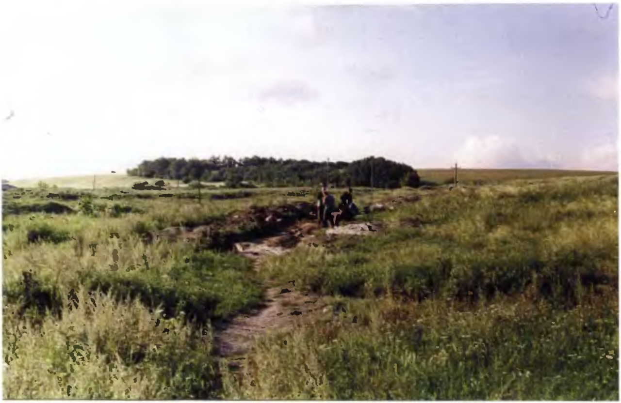 Вид на городище с востока из поймы. Стрелками показан эскарп. Могильник І. Вид на раскоп 11 с юга.
