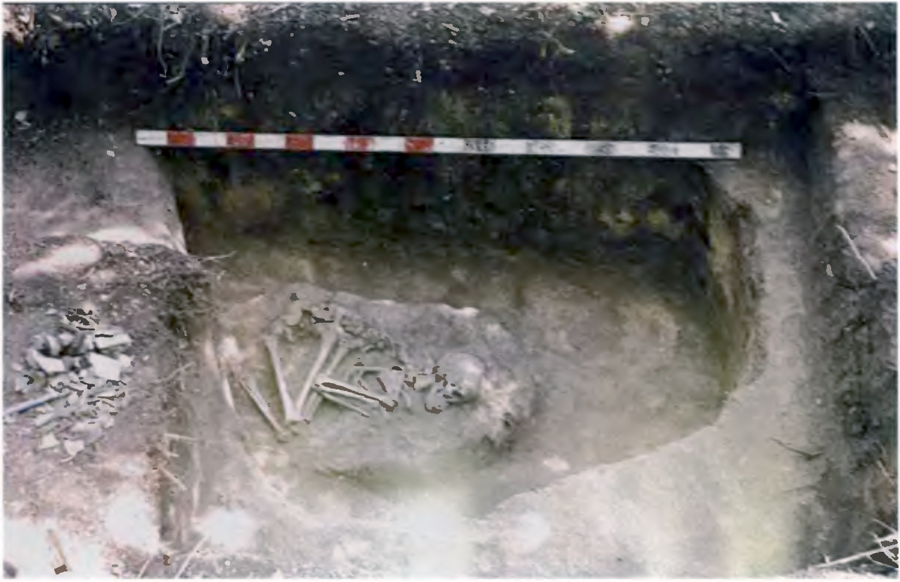Погребенный был уложен вытянуто на спине, головой на запад. Череп лежал лицевой частью вверх. Руки вытянуты вдоль туловища, кисти находятся под крыльями таза. Правая нога чуть согнута в коленном суставе и завалена на правый бок. Левая нога лежит прямо. Стопы сведены вместе. С правой стороны у нижних ребер на дне могилы лежал маленький обломок медного предмета. Между костей таза вертикально, с небольшим наклоном стоял оселок из зеленого камня6.