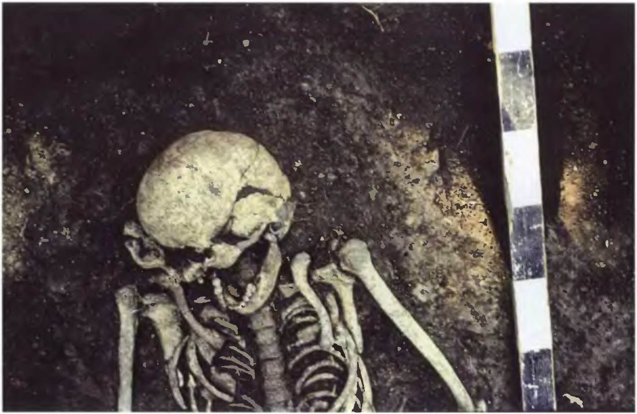 Погребение 195. Расчищено в квадрате А-11. Произведено в яме с подбоем. Данное погребение представляет собой вторую подбойную могилу среди исследованных погребений кладбища. Яма имела прямоугольную форму и была ориентирована длинной осью по линии ЗСЗ-ВЮВ (рис. 56). Вдоль северной стенки на уровне -0,66 м от СП шла неширокая ступенька. Еще один узкий уступ (ширина до 0,03 м) находился на уровне -0,82 м внутри могильной ямы. Камера имела подпрямоугольную форму. Дно ее находилось на уровне -0,86 м от СП. В южной стенке камеры находился подбой глубиной до 0,10 м. От костей погребенного ребенка сохранились части черепа и два ребра. Положение остатков черепа и зубов свидетельствует, что голова погребенного была развернута лицом к югу. Инвентаря нет.