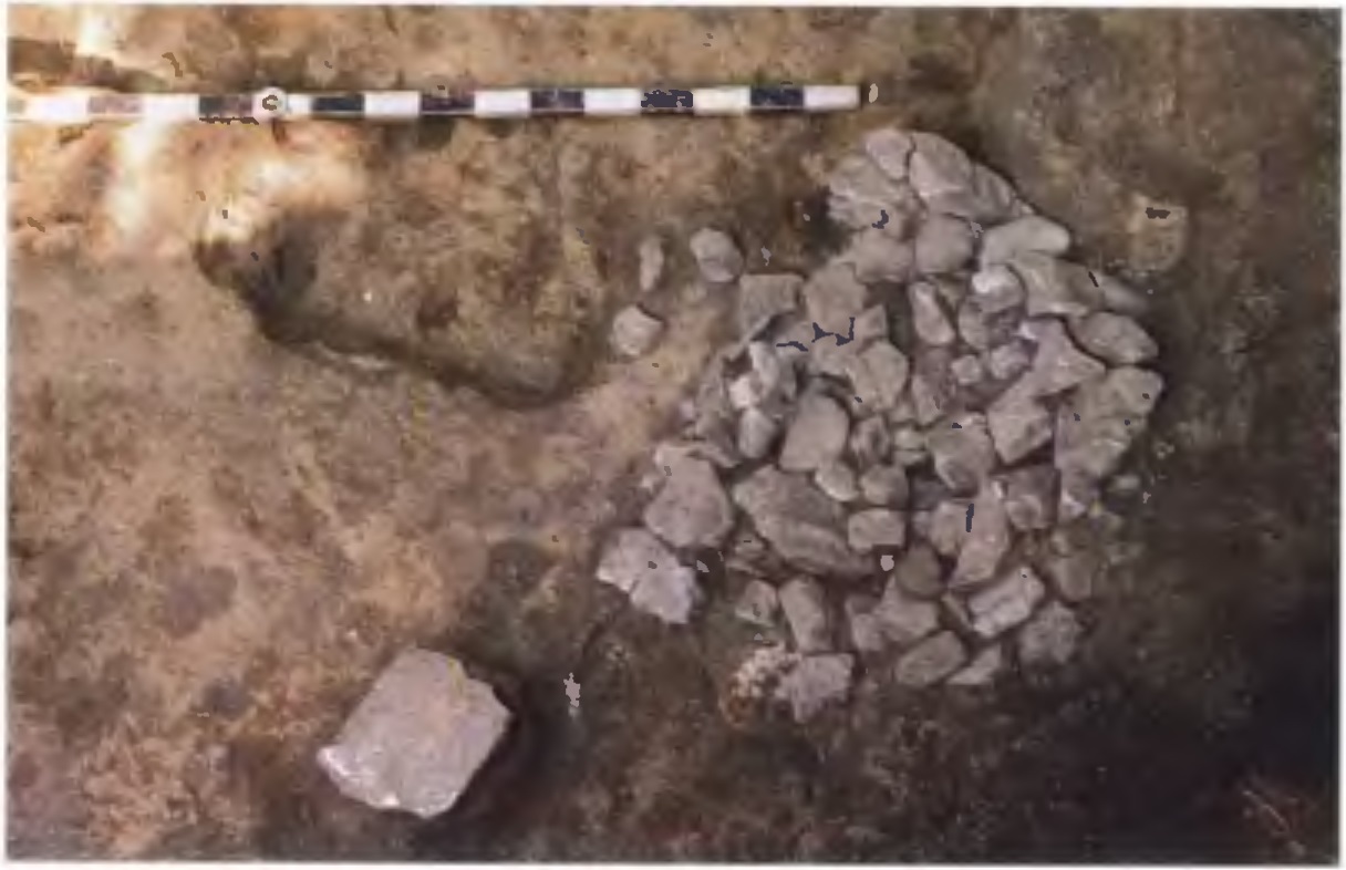 Погребение 177. Обнаружено в квадратах А-6-7. Сохранилась относительно широкая погребальная камера, ориентированная длинной осью по линии ЗСЗ-ВЮВ (рис. 57). От погребенного ребенка сохранились обломки черепа, развернутого лицевой частью к югу и плечевая кость руки. Глубина камеры: -0,85 м от СП. Инвентаря нет.