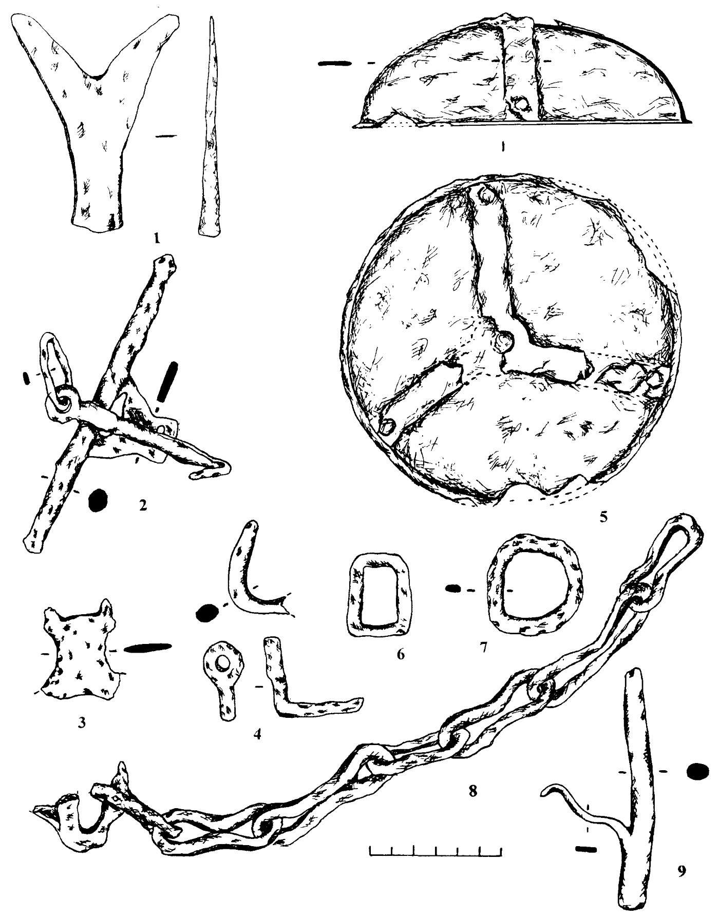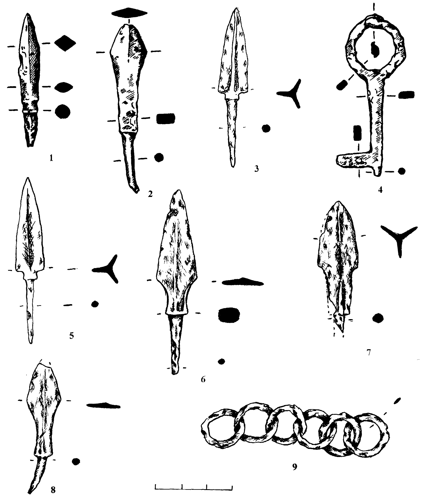 Среди сидоровских находок выделяется небольшая группа предметов вооружения: наконечники стрел, кольчужная цепочка и выпуклая бляха (полусферический умбон от щита). Наконечников стрел найдено 8, один из которых обнаружен в заполнении хоз. ямы 7 р.2 (рис.39, 5). Второй идентичный наконечник был найден в верхнем слое р.3 (рис.39, 2). Еще один такой же наконечник в 1992 г. был подобран с поверхности распаханного поля в пределах линии укреплений Малого Городища (хранится в фондах Славяногорского историко-архитектурного заповедника). Все три описанных наконечника относятся к типу 13 (трехлопастный, по А.Ф.Медведеву). Они имеют широкий круг аналогий и верхнюю дату, не выходящую за пределы 1Хв. (Медведев А.Ф., 1966, с.59, табл.13,10). Еще один трехлопастный ступенчатый наконечник, (рис.39, 7) найденный в подъемном материале, близок наконечникам 20 типа, датировку которых А.Ф.Медведев определяет в границах V-IX вв. (Медведев А.Ф, 1966, с.60, табл.30, 20). Кроме описанных, в подъемном материале памятника были найдены еще три двухлопастных наконечника и один бронебойный. Последний (рис.39, 1) близок наконечникам стрел 95 типа (VIII-IX вв.) (Медведев А.Ф., 1966, с.84, 109, табл. 12, 45). Из двухлопастных – два (рис.39, 6, 8) имеют сходство с типом 52, вид 2 (VIII-XIII вв.) (Медведев А.Ф., 1966, с.69, табл.12, 38), а один (рис.39, 2) – с наконечниками стрел 43 типа (IX-X вв.) (Медведев А.Ф., 1966, с.66, табл.16, 2). Кольчужная цепочка сделана из крупных плоских колец диаметром 1,6 см (рис.39, 9).
