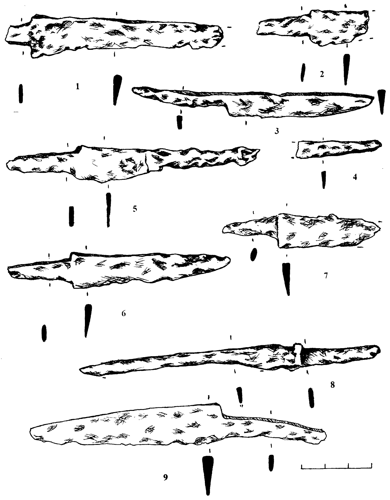 Рис. 40. Сидорово. 1-2 – возможные варианты использования железной бляхи из хоз. ямы 9; 3 - татарский шлем XVII в. (Kovacs S., 1997, р.187, fig.5). Рис. 41. Сидорово. Ножи. 7 – пом. З (дно); 9 – раскоп 2, верхний слой; 1-6, 8 – подъемный материал.