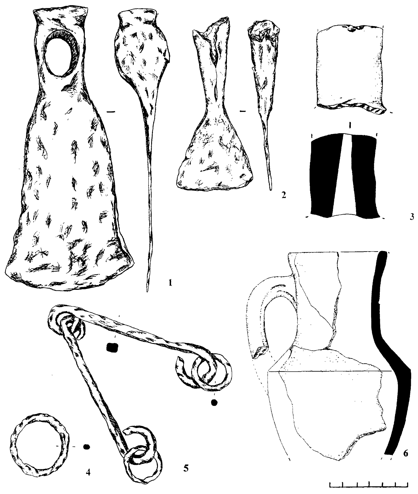 Сидорово. Керамические (3, 6) и железные (1, 2, 4, 5) предметы с городища Сидорово. Железные предметы. Подъемный материал