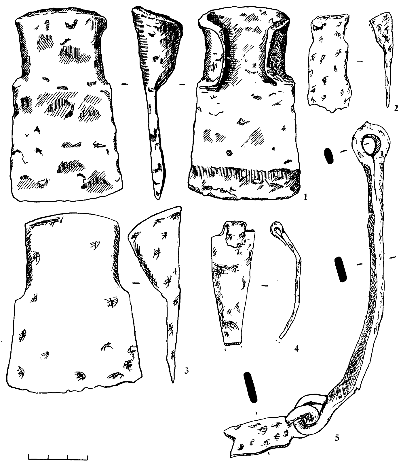 Среди железных предметов хозяйственного назначения особенно многочисленны ножи, встречающиеся как в хозяйственных комплексах, так и в подъемном материале. Целые экземпляры имеют небольшие размеры (рис.41) и представлены обычными для салтовских памятников типами (Міхєєв В.К., Степанська Р.Б., Фомін Л.Д., 1973, с.90-99). Несколько отличен от них обоюдоострый предмет с черенком, напоминающий по форме наконечник стрелы или дротика (рис.27, 3). Листовидная форма лезвия, крупные для стрелы размеры, загнутый конец черешка, свидетельствующий, что на нем находилась ручка, говорит в пользу того, что данный предмет использовался в качестве ножа. Среди прочих железных предметов представлены гвозди (рис.34, 3, 6), фрагмент лезвия топора, пружинных ножниц, маленькое зубиль-це (рис.34, 1), головка молотка-гвоздодера. Последний, судя по сохранившейся части, имел железную ручку, ныне обломанную (рис.34, 2), и напоминал поздние гвоздодеры древнерусских городов (Новгород ХІ-ХІІІ вв.) (Колчин Б.А., 1985, с.258, табл.100, 16, 17). Из предметов конской сбруи найдены фрагменты верхней части стремени с выделенной петлей для путлища (рис.38, 3), звено двусоставных удил с прямыми псалиями (рис.38, 2) (типа I) (Кирпичников А.Н., 1973, табл. I, 1,4), а также двусоставные удила (рис.42, 5) (тип IV) (Кирпичников А.Н., 1973, с.14, 17, 18, рис.38, 6, 7).