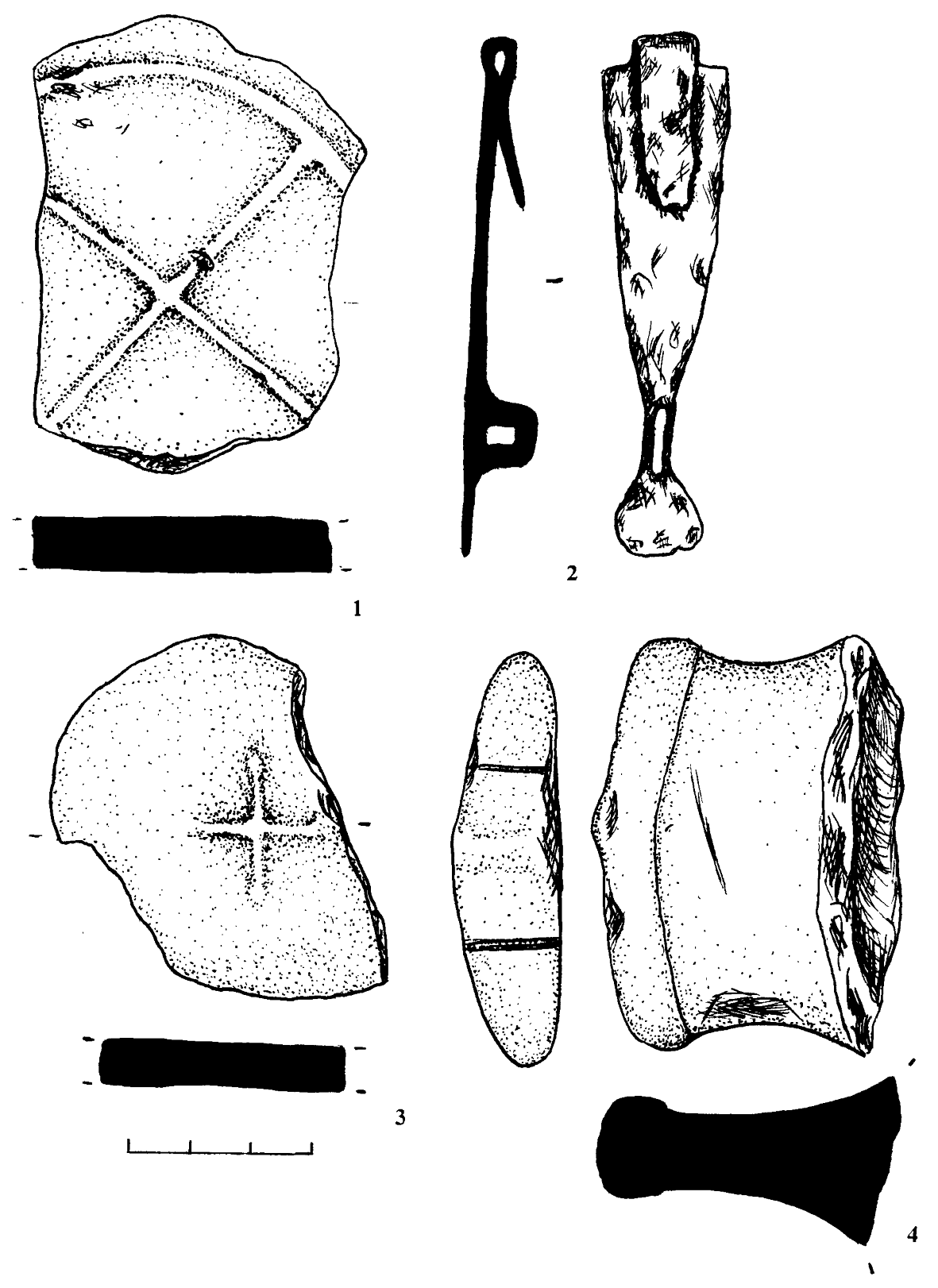 Изделий из цветных металлов найдено немного, и все они обнаружены вне археологических комплексов. Так, на поле, на месте, где в дальнейшем был разбит раскоп 2, в 1995 г. был найден колокольчик из белого металла (рис.36, 16), близкие аналоги которому имеются в венгерских материалах, а также на Царином городище (Михеев В.К., 1985, рис. 19, 15, 16). Из подъемного материала происходит треугольнорамчатая пряжка с узким овальным, заостренным в нижней части гладким щитком (рис.36, 13). Близким аналогом ей представляется пряжка из Барановки, датируемая солидом 751-754 гг. (Круглов Е.В., 1992, с.179, 182, рис.4, 5), и пряжка из катакомбы 21 Старого Салтова (Комар А.В., 1999, табл.2, 82). Из пахотного слоя Малого Городища происходят две идентичные бляшки (рис.36, 8, 9), имеющие близкие аналоги в крымских древностях салтово-маяцкой культуры (Комар А.В., 1999, табл.З, 9), фигурная пластина (рис.36,10) и фрагменты бронзовых предметов (рис.36, 11,12). На Большом Городище, снова же, в подъемном материале была найдена местными жителями золотая нашивка на головной убор (рис.36, 14) с тисненым изображением четырехконечной розетки, образованной стилизованными цветами лотоса, радиально расходящимися из центра. Крестообразное расположение стилизованных цветов лотоса имеется на сбруйной бляшке из Верхне-Салтовского могильника (ФоняковаН.А., 1986, рис.4, 14) и на щитке перстня из погребения в кургане 3 могильника Камыши 1 в Центральной Барабе (VIII-X вв.) (Молодин В.И., Мороз М.В., Гришин А.Е., Гаркуша Ю.Н., 2000, с.221, рис.1, 16). Среди находок обращает на себя внимание бронзовое биконическое грузило (рис.36,15). Еще одно, близкое по форме, грузило из бронзы было найдено в 7-8 км вниз по течению Северского Донца на поселении Осиянская Гора. Употребление цветного металла для изготовления указанных предметов не совсем понятно. Возможно, подобные грузила использовались как гирьки.