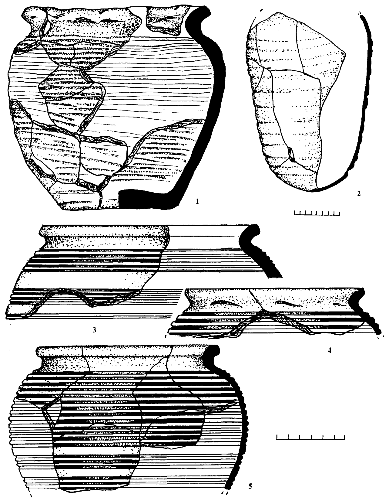 Рис. 44. Сидорове). Керамика (1, 3, 4) и железные предметы (2) из подъемного материала. Рис. 45. Сидорово. Керамика. 1,5 – верхний слой раскопа 3; 2 – хоз. яма 2э; 3, 4 – пом.3.