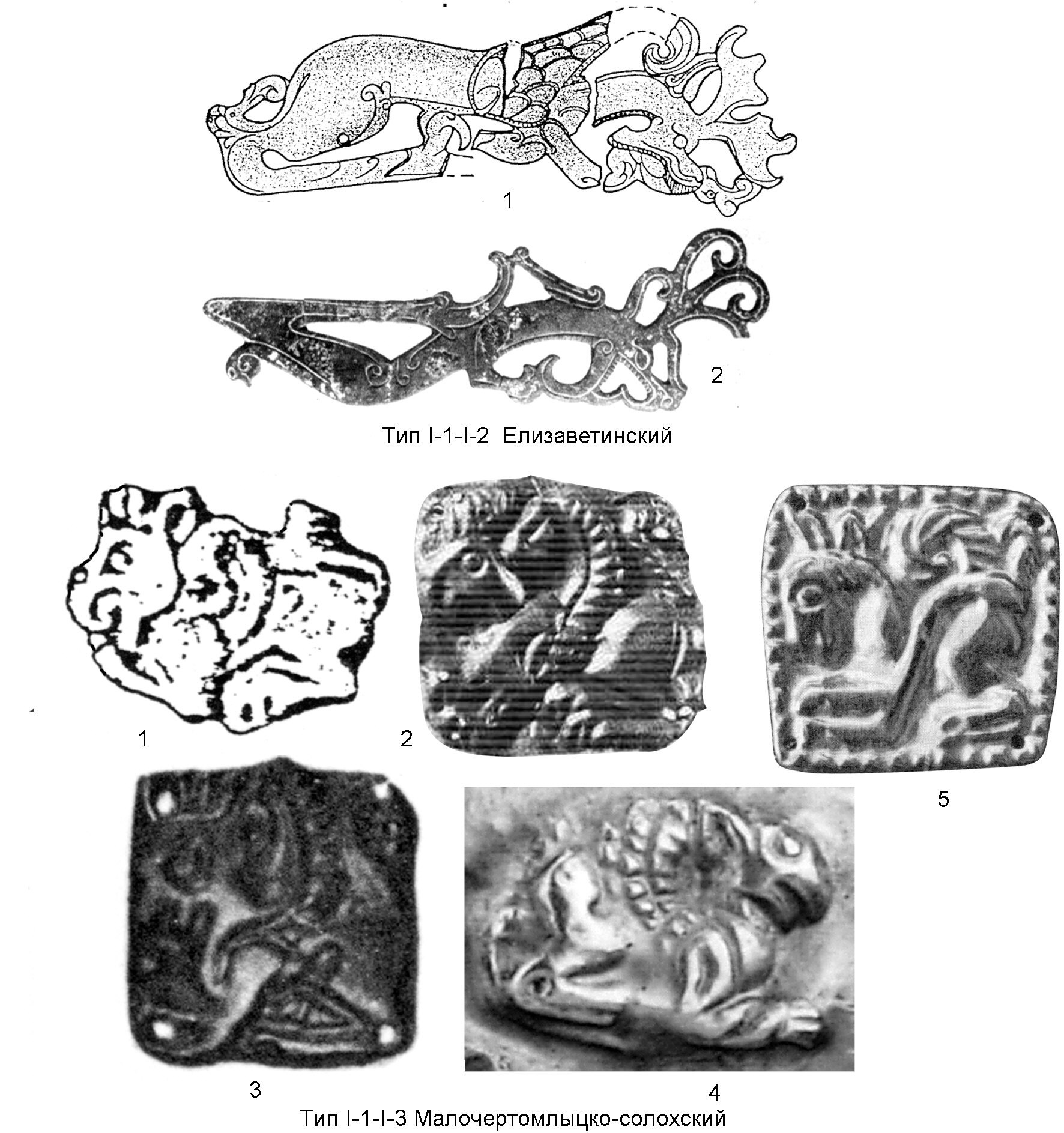 1-1, 1-2, 2-1, 2-2а – курган у с.Защита (по: Яценко И.В. Искусство эпохи раннего железа. Илл.5, 6; Бокiй Н.М. Новi пам’ятки скiфського звiриного стилю в Кiровоградщини // Археологiя. XXIII. 1970. С. 184. Рис. 2: 1-6); 3-а, 3-б - Дуровка, курган 1 (рисунок (3-а) по: Пузикова А.И. Курганные могильники скифского времени Среднего Подонья (публикация комплексов). М., 2001. 209, рис.7: 1), фото (3-б) по: Яценко И.В. Искусство эпохи раннего железа. Илл.14; 4 - Слоновская Близница (по: Древности Геродотовой Скифии. Сборник описаний археологических раскопок и находок в Черноморских степях. Вып. II. СПб., 1872. Табл. XXXVI: 1, 2)