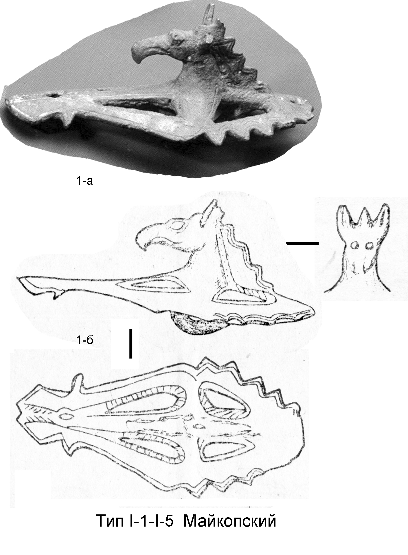 Тип I-1-I-5 Майкопский составлен единственным изображением, оформляющим бронзовый налобник из Прикубанья - случайную находку в районе Майкопа (1). Здесь представлен монстр с головой хищной птицы, острыми (вольчими?) ушами, гребнем рептилии, передними ногами копытного и задними ногами хищника, т.е. существо, близкое канону позднегреческого грифона. Моделировка шеи и головы скульптурная, рассчитанная на трехмерное обозрение, моделировка минимизированного туловища и ног плоскостная, рассчитанная на одностороннее обозрение, в ракурсе в плане (оборотная сторона примыкает к морде лошади), с оформлением деталей углубленными линиями. Хищник лежит с вытянутыми вперед прямыми ногами, развёрнутыми в плане, причем передние ноги сходятся в окончаниях внешними сторонами копыт, задние расходятся, упираясь окончаниями в локтевые суставы передних ног. В плане фигура имеет асимметрично-ромбические очертания. Шея перпендикулярна туловищу, голова перпендикулярна шее (рис. 9).