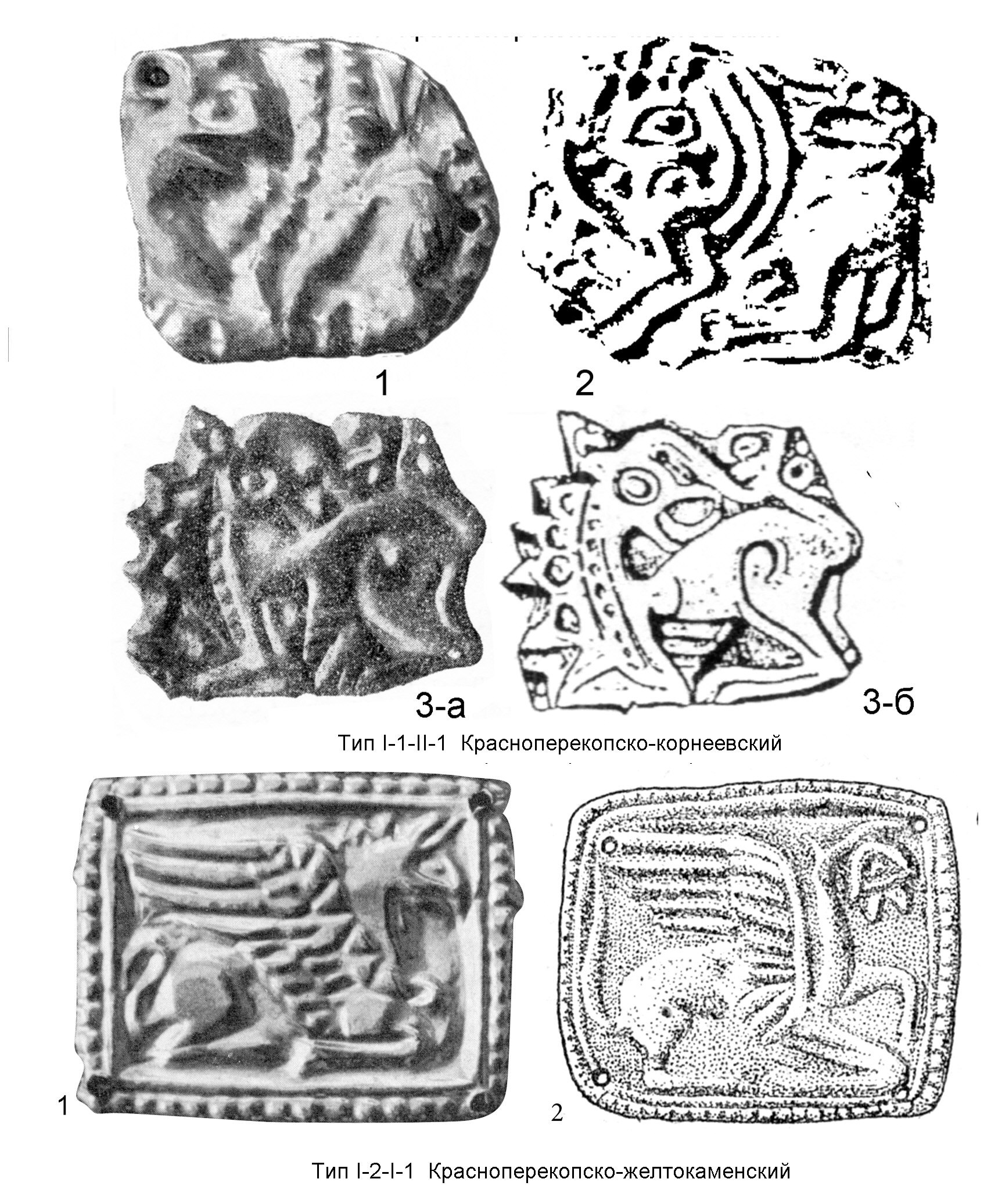 1 - Красноперкопские курганы, курган 22 (по: Лесков О.М. Указ. соч. Рис.82); 2 - Корнеевка, курган 2, погребение 3 (по: Ковалев Н.В., Полин С.В. Скифские курганы у с. Корнеевка Запорожской области // Курганы степной Скифии / Под ред. Ю.В. Болтрика, Е.П. Бунятян. Киев, 1991. Рис. 9:3); 3-а, 3-б – Мастюгино, сборы А.А. Спицына из грабительских раскопок кургана в 1905 г. (фото (3-а) по: Отчет Императорской археологической комиссии за 1905 г. СПб., 1908): рисунок (3-б) по: Гуляев В.И. На восточных рубежах Скифии (древности донских скифов). М., 2010. Рис.29, третий ряд сверху, первый рисунок слева). Тип I-2-I-1 Красноперекопско-желтокаменский. 1 - Красноперекопские курганы, курган 22 (по: Лесков О.М. Указ. соч. Рис.77 левый); 2 – Желтокаменка (по: Мозолевский Б.Н. Скифский царский курган Желтокаменка // Древности степной Скифии / Под ред. А.И. Тереножкина, Б.Н. Мозолевского, Е.В. Черненко. Киев, 1982. Рис.37: 24)