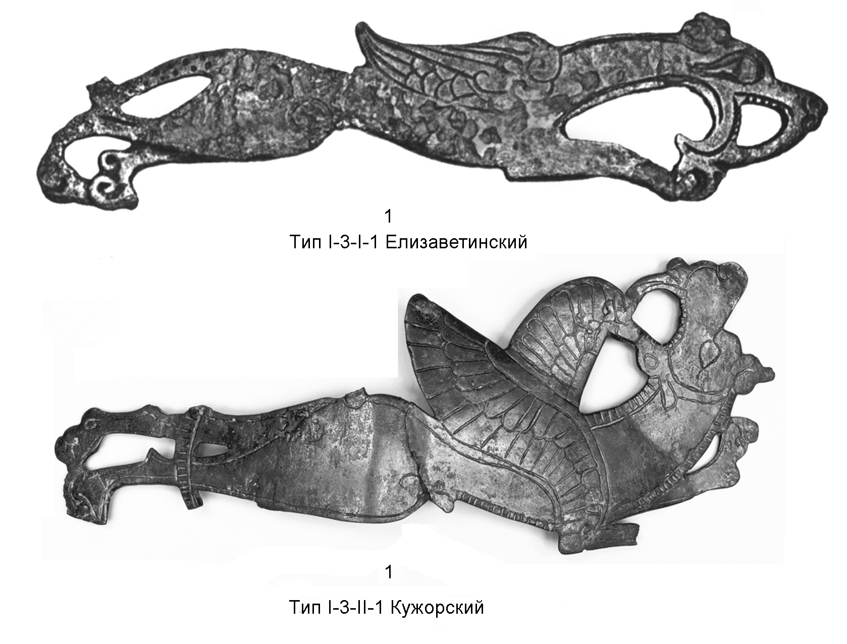 Тип I-3-I-1 Елизаветинский представлен единственным изображением, происходящим с территории Прикубанья - на бронзовом конском налобнике из Елизаветинского кургана 7/1917 г. (1). Это одностороннее плоскостное изображение на ажурном плоском щитке наносника, с проработкой деталей углубленными линиями и прорезями. Здесь представлена фигура синкретического существа - крылатого хищника, наделенного чертами семейства кошачьих (короткое широкое ухо), с клювовидными загнутыми вниз челюстями. Ракурс в передней части строго профильный, тогда как задние ноги отображены обе (в их нижней части). Зверь показан в прыжке с вытянутой вперед шеей, с выброшенной вперед передней и вытянутыми назад задними ногами, одна над другой (правая задняя нога в бедренно-коленной части полностью перекрывает левую заднюю, стопа правой проходит над стопой левой и загибается к ее окончанию). Голова монстра перпендикулярна шее, опущена и упирается окончаниями клювовидных челюстей в переднюю лапу. Ухо выполнено в виде птичьей головки с загнутым клювом. Ноздря одновременно играет роль глаза дополнительной птичьей головки, клюв которой помещен в основании верхнего клыка основного монстра. Трактовка деталей подробная и в то же время условная (рис. 11).